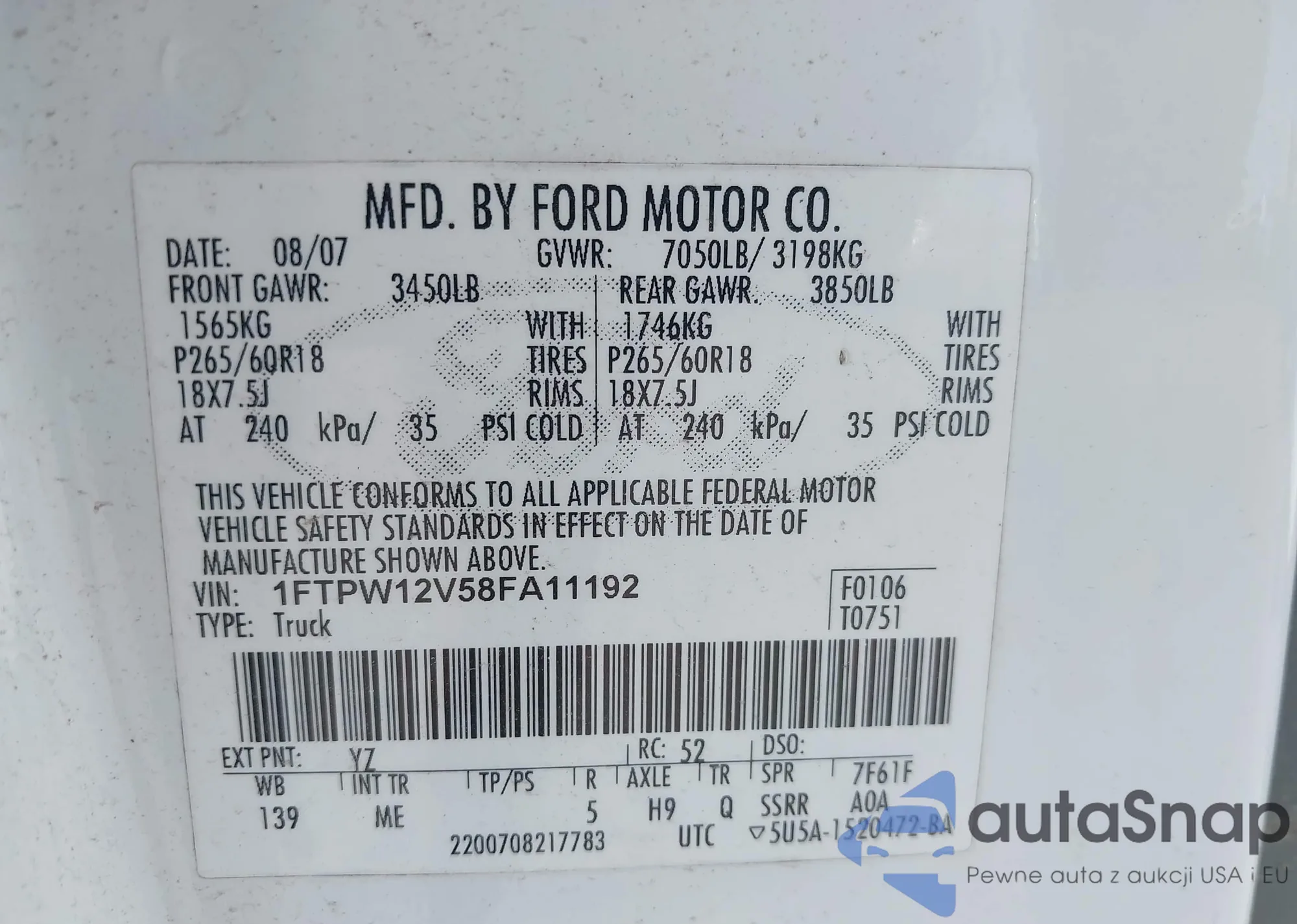 LOT: 43333414 VIN: 1FTPW12V58FA11192