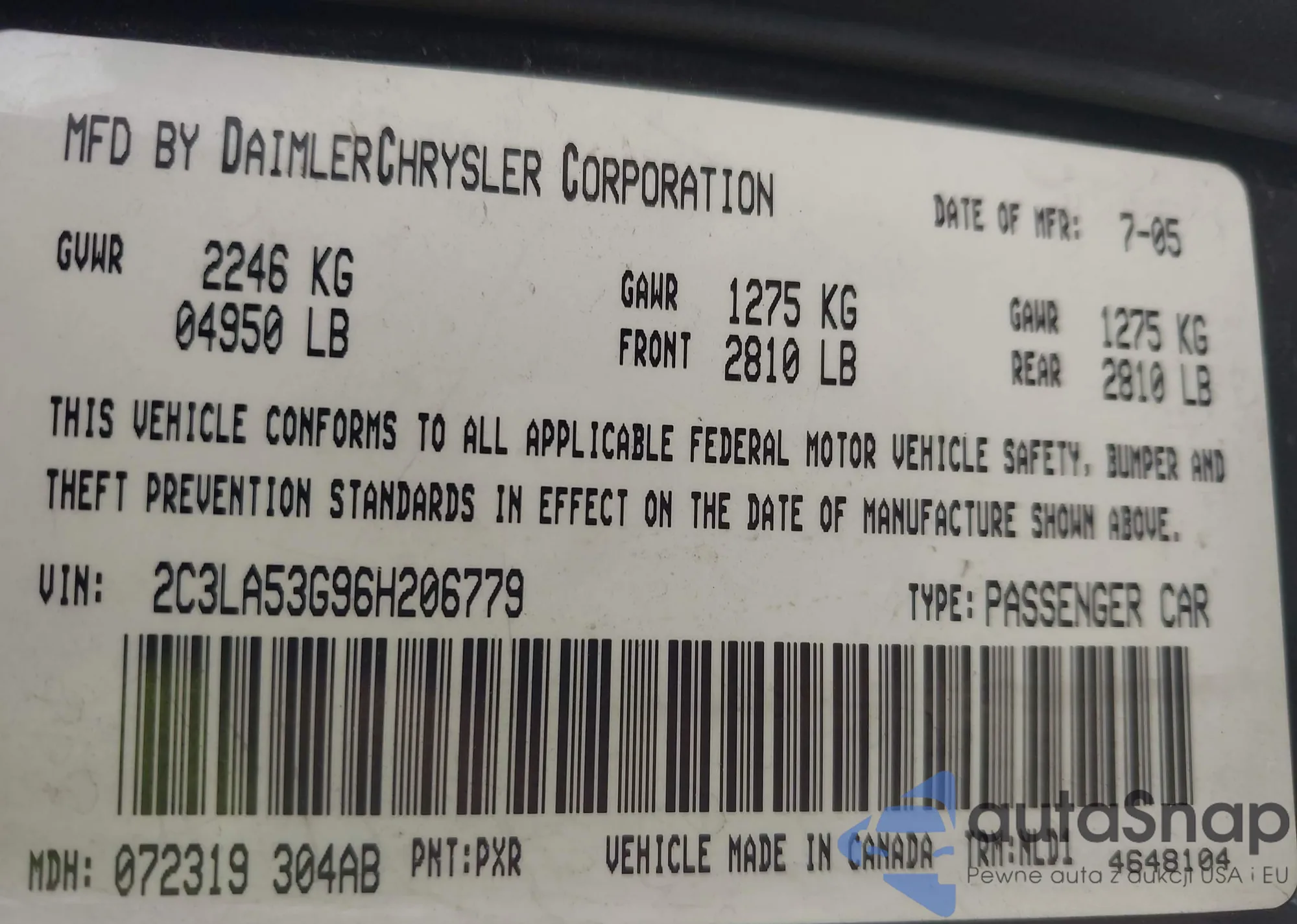 • VIN 2C3LA53G96H206779