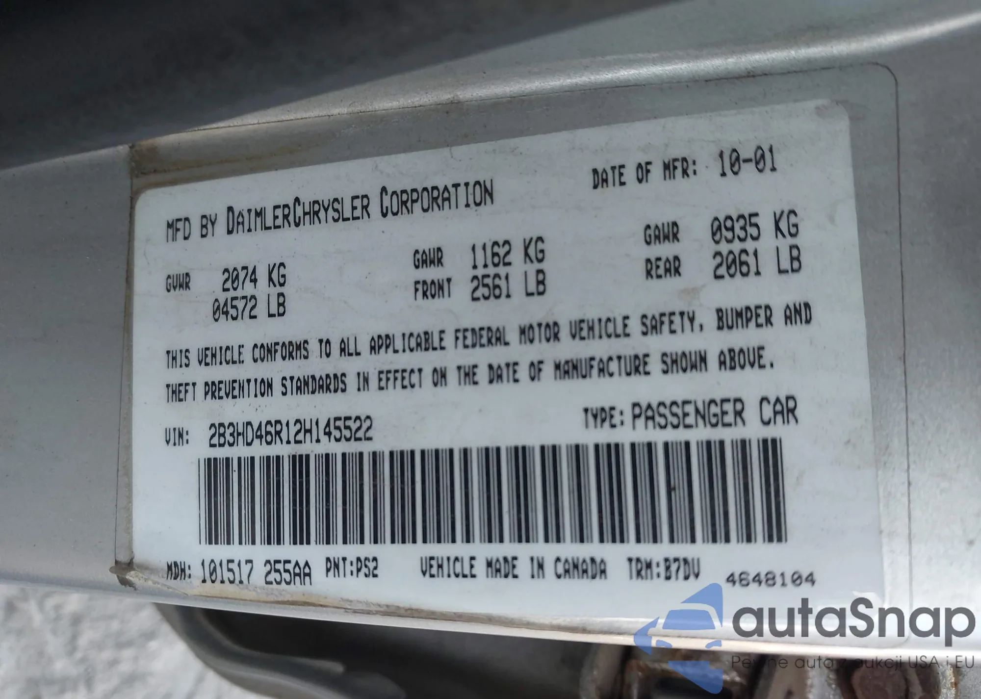 LOT: 43346246 VIN: 2B3HD46R12H145522