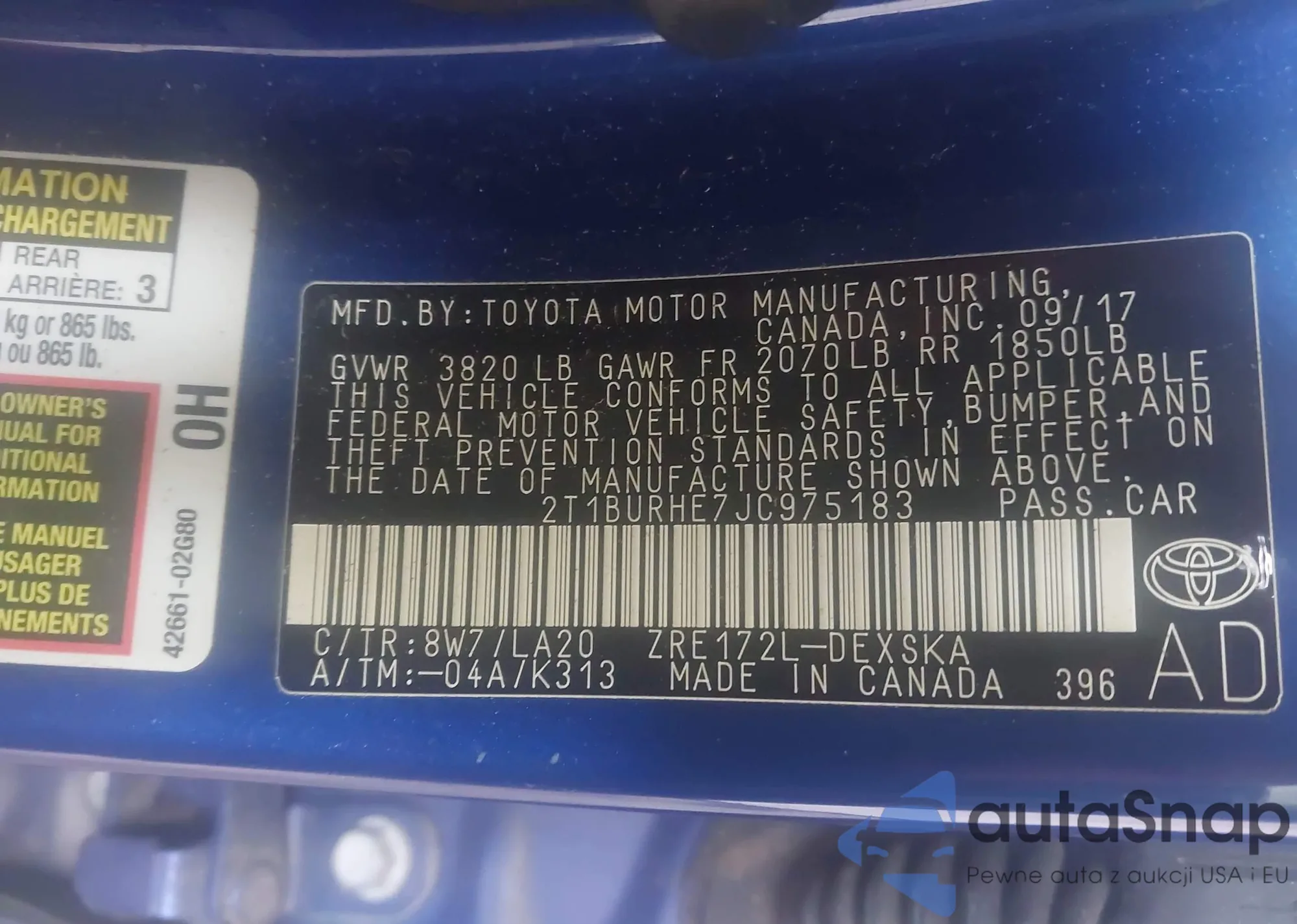 LOT: 43318694 VIN: 2T1BURHE7JC975183