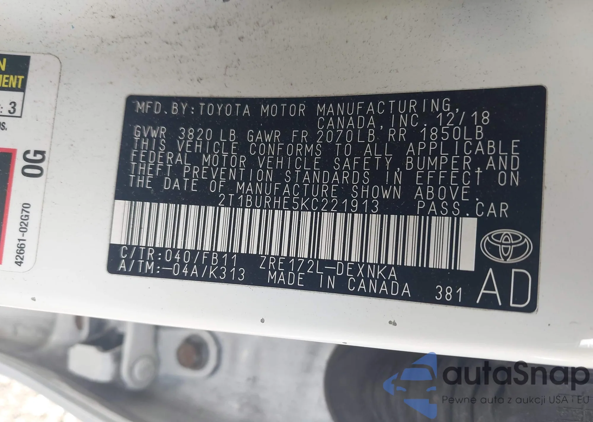 LOT: 43330141 VIN: 2T1BURHE5KC221913