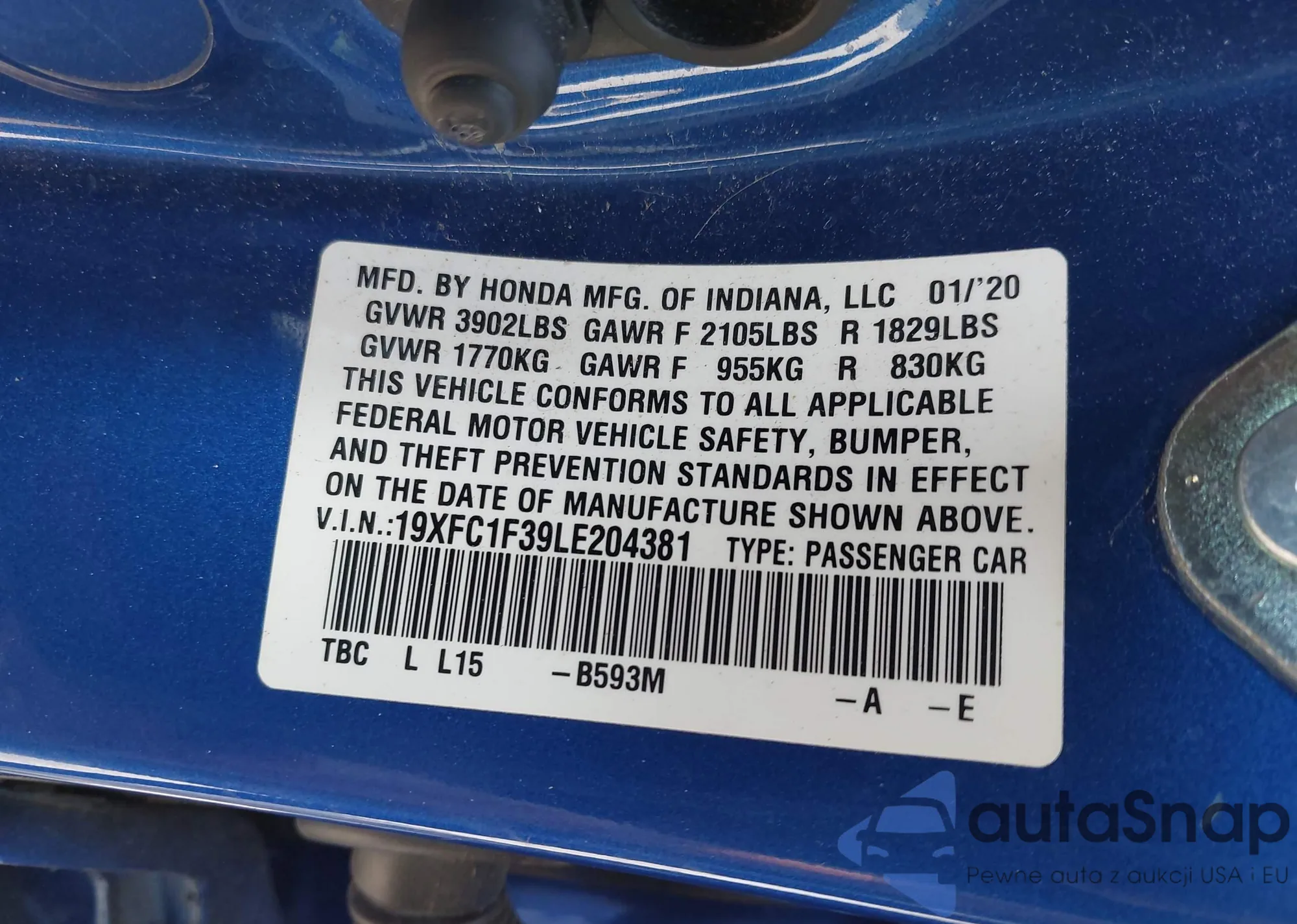 • VIN 19XFC1F39LE204381