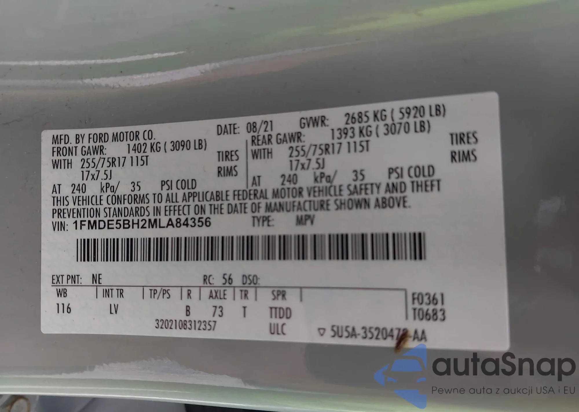 LOT: 42919704 VIN: 1FMDE5BH2MLA84356