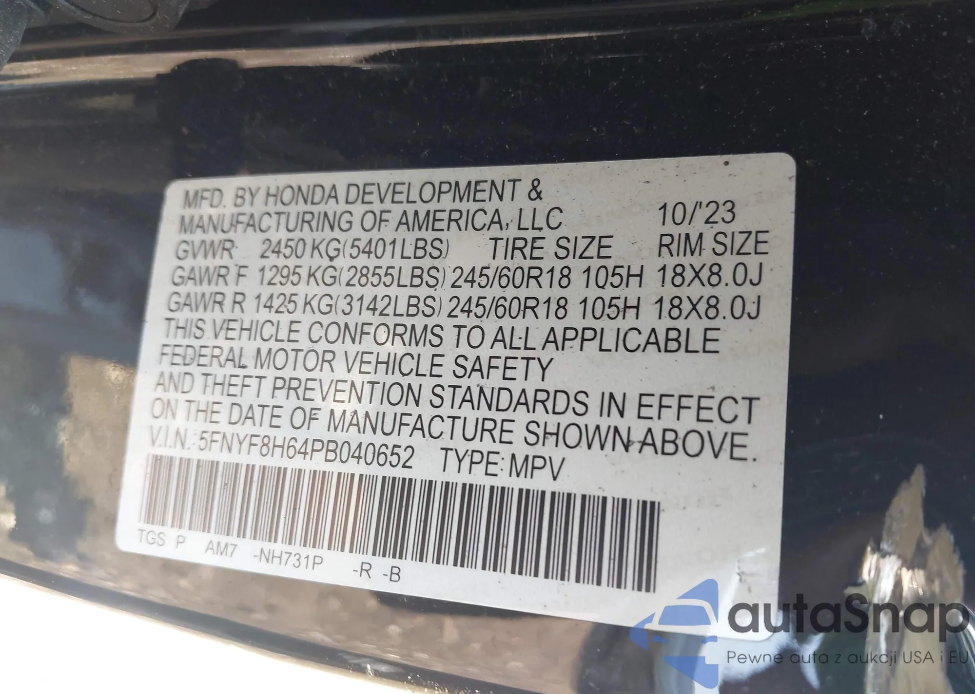 LOT: 42903356 VIN: 5FNYF8H64PB040652