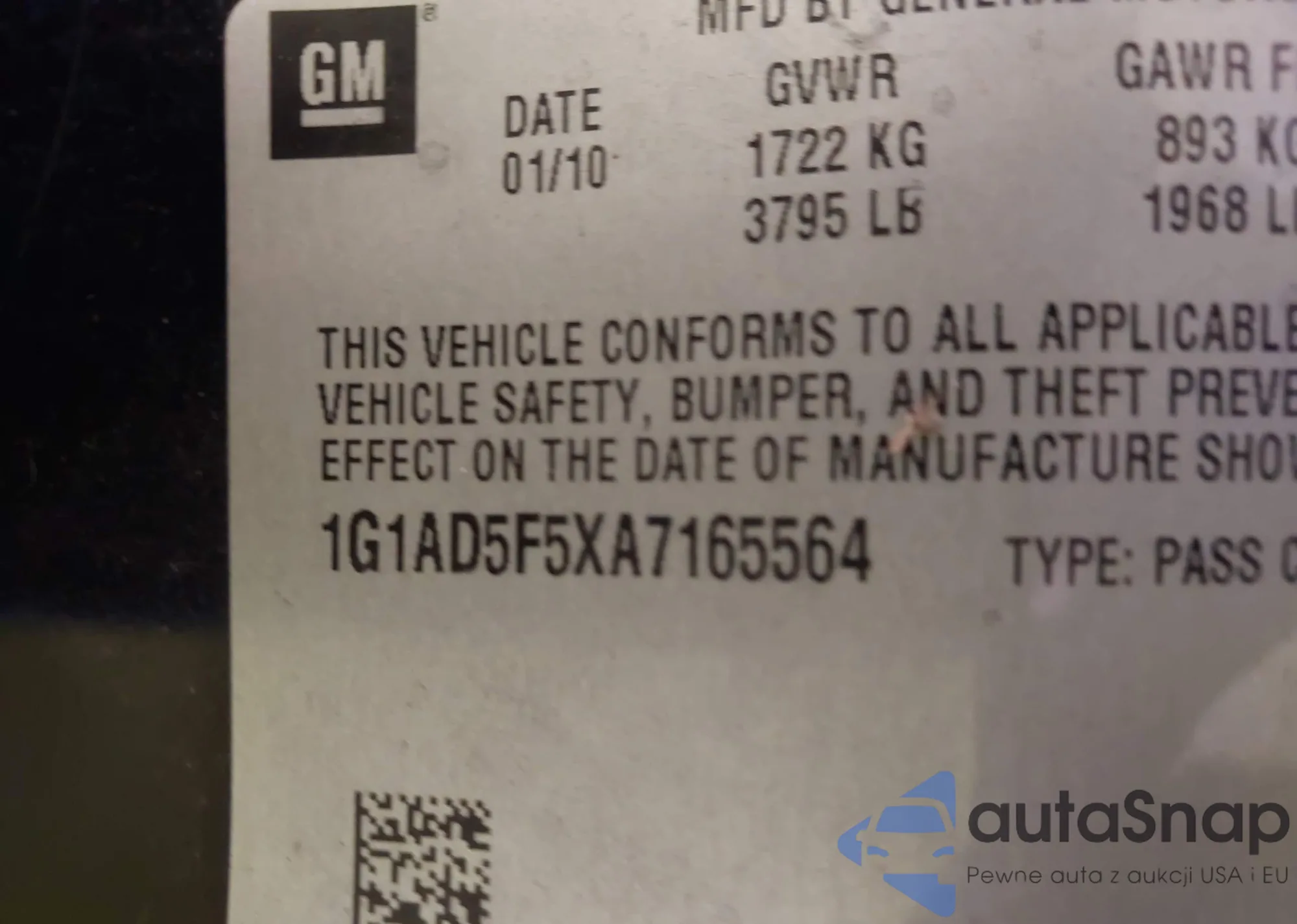 LOT: 43174300 VIN: 1G1PA5SH3E7275560