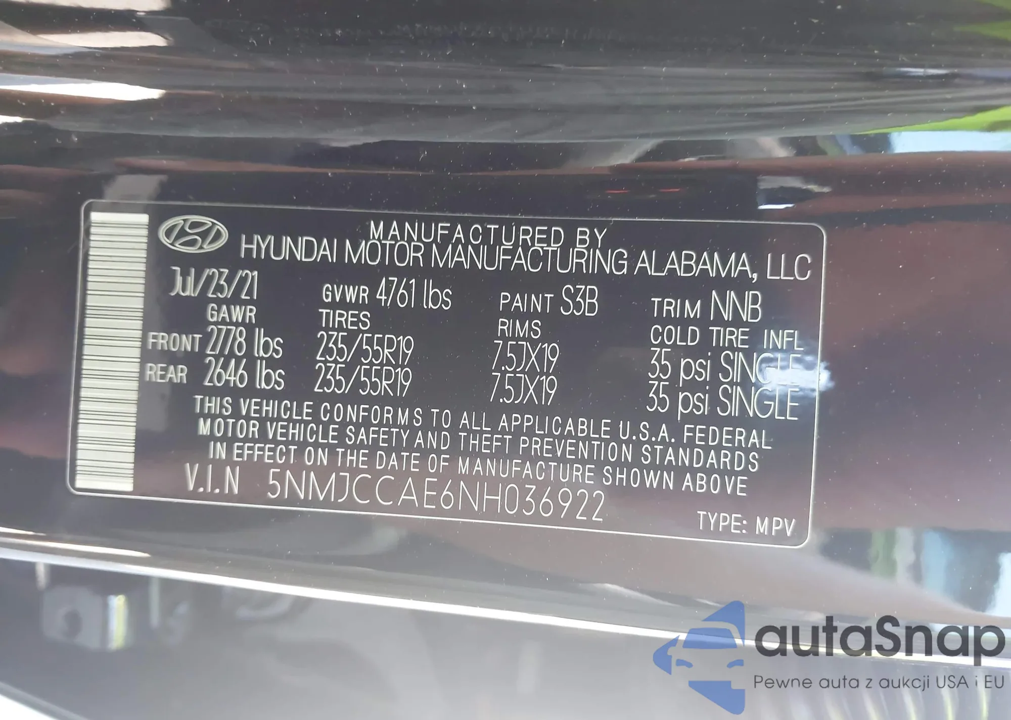 • VIN 5NMJCCAE6NH036922