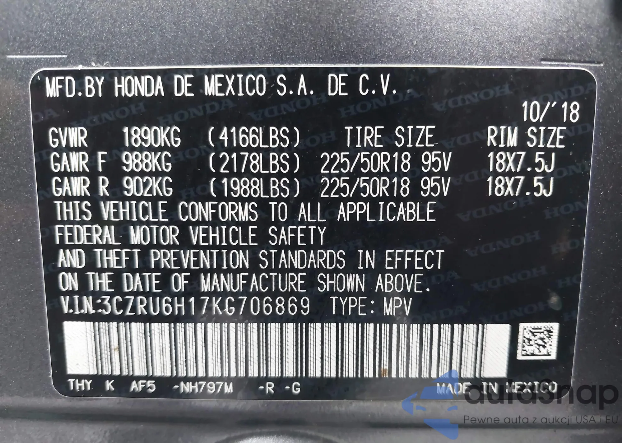 • VIN 3CZRU6H17KG706869