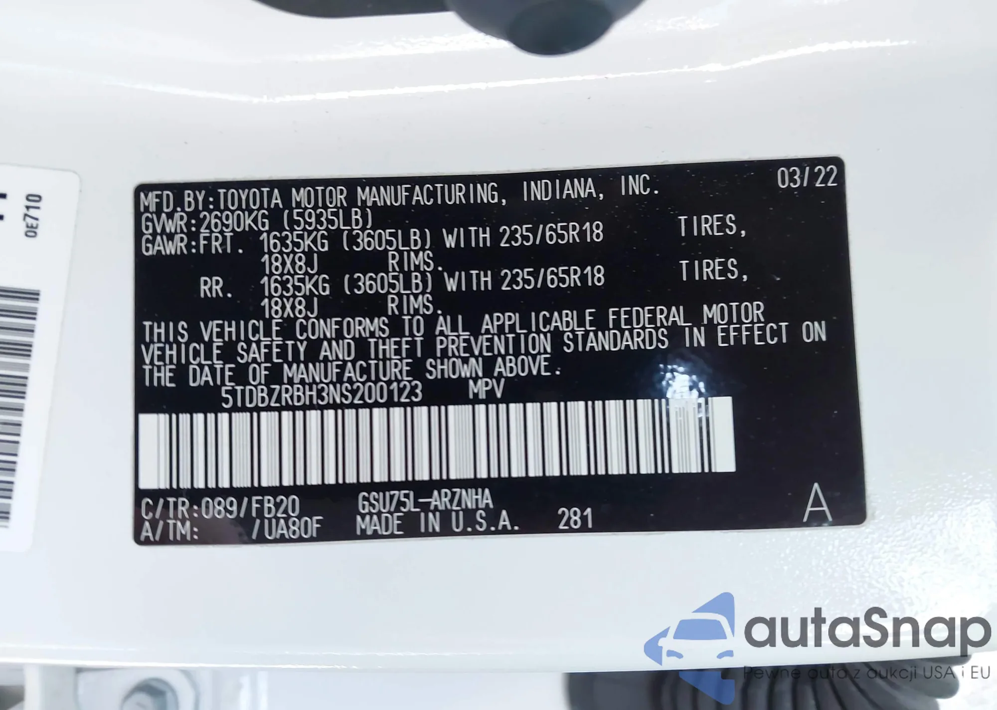 LOT: 43198891 VIN: 5TDBZRBH3NS200123