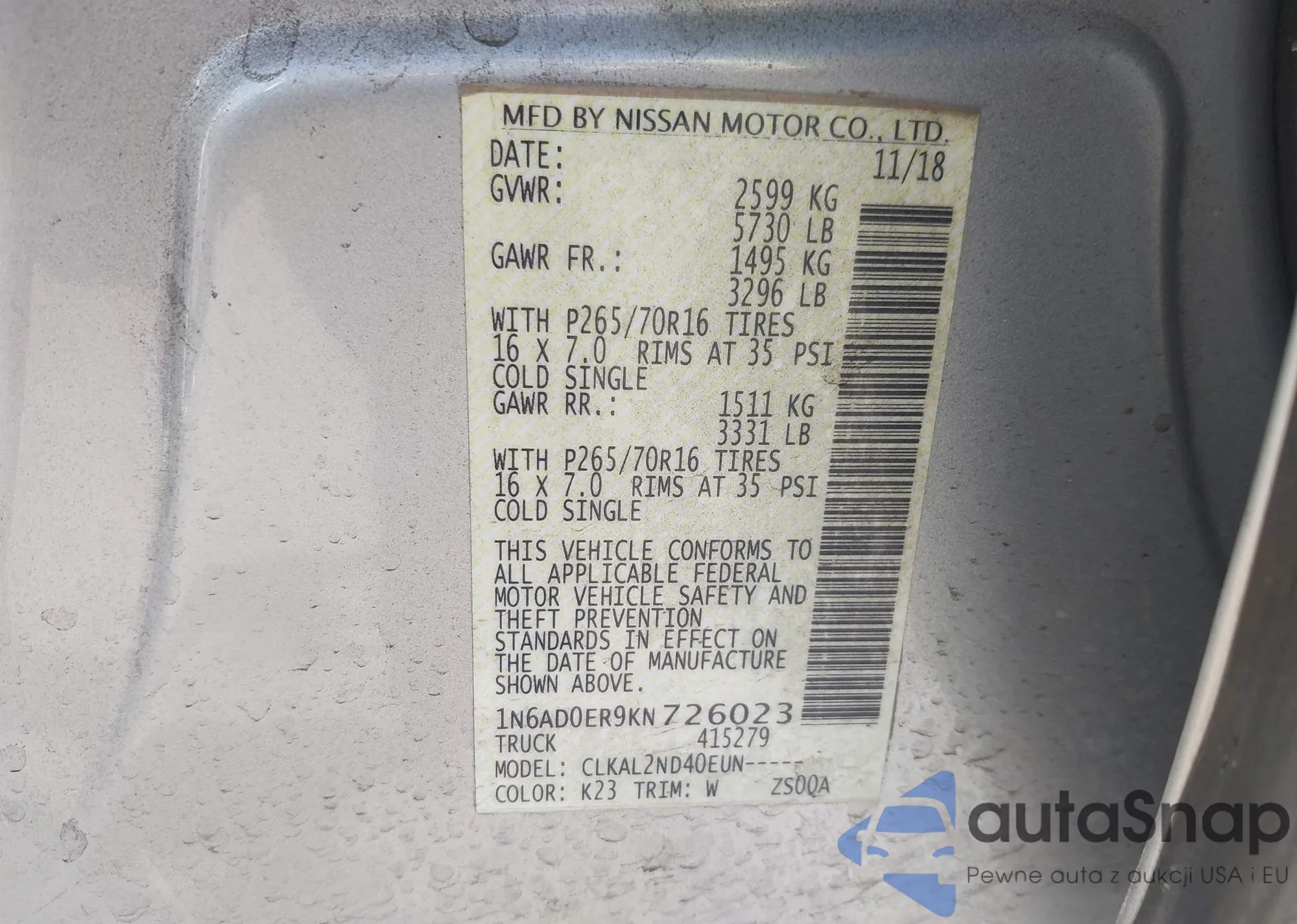 LOT: 43191034 VIN: 1N4AL2AP7AN449432
