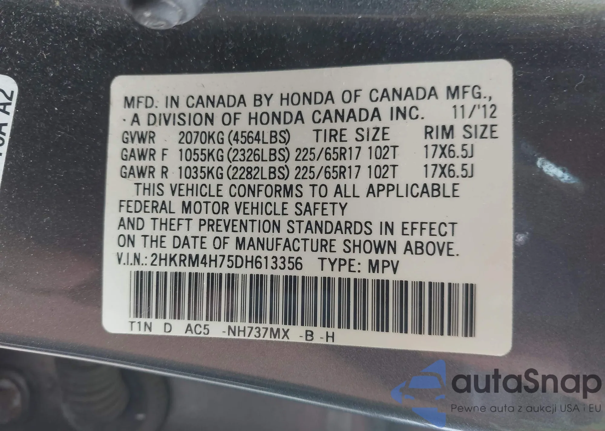 • VIN 2HKRM4H75DH613356