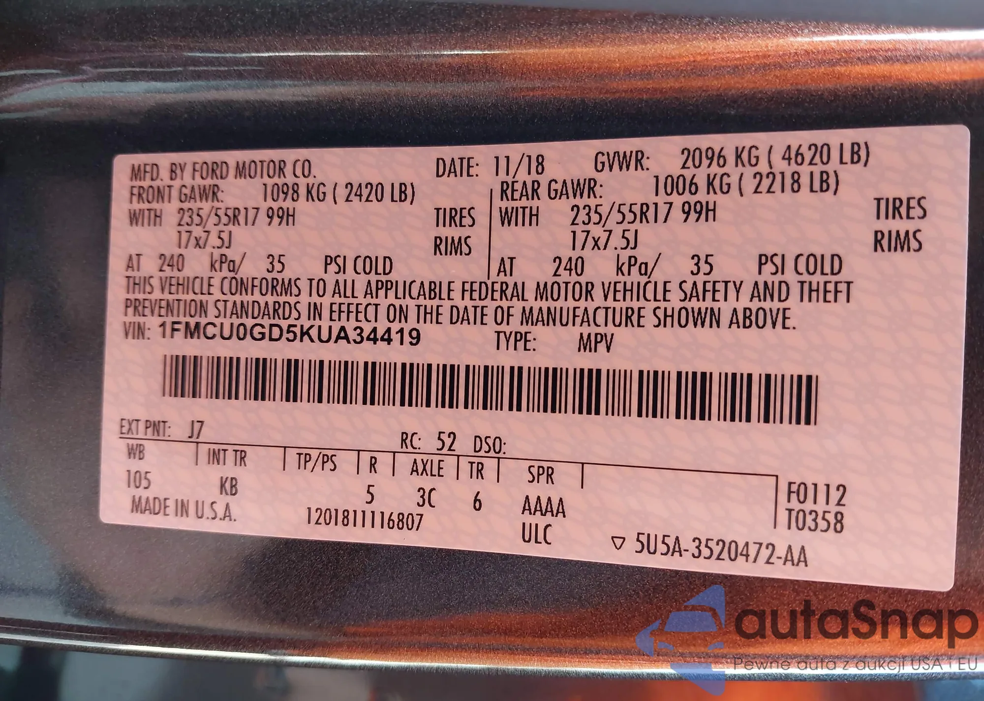 LOT: 43229592 VIN: 1FMCU0GD5KUA34419
