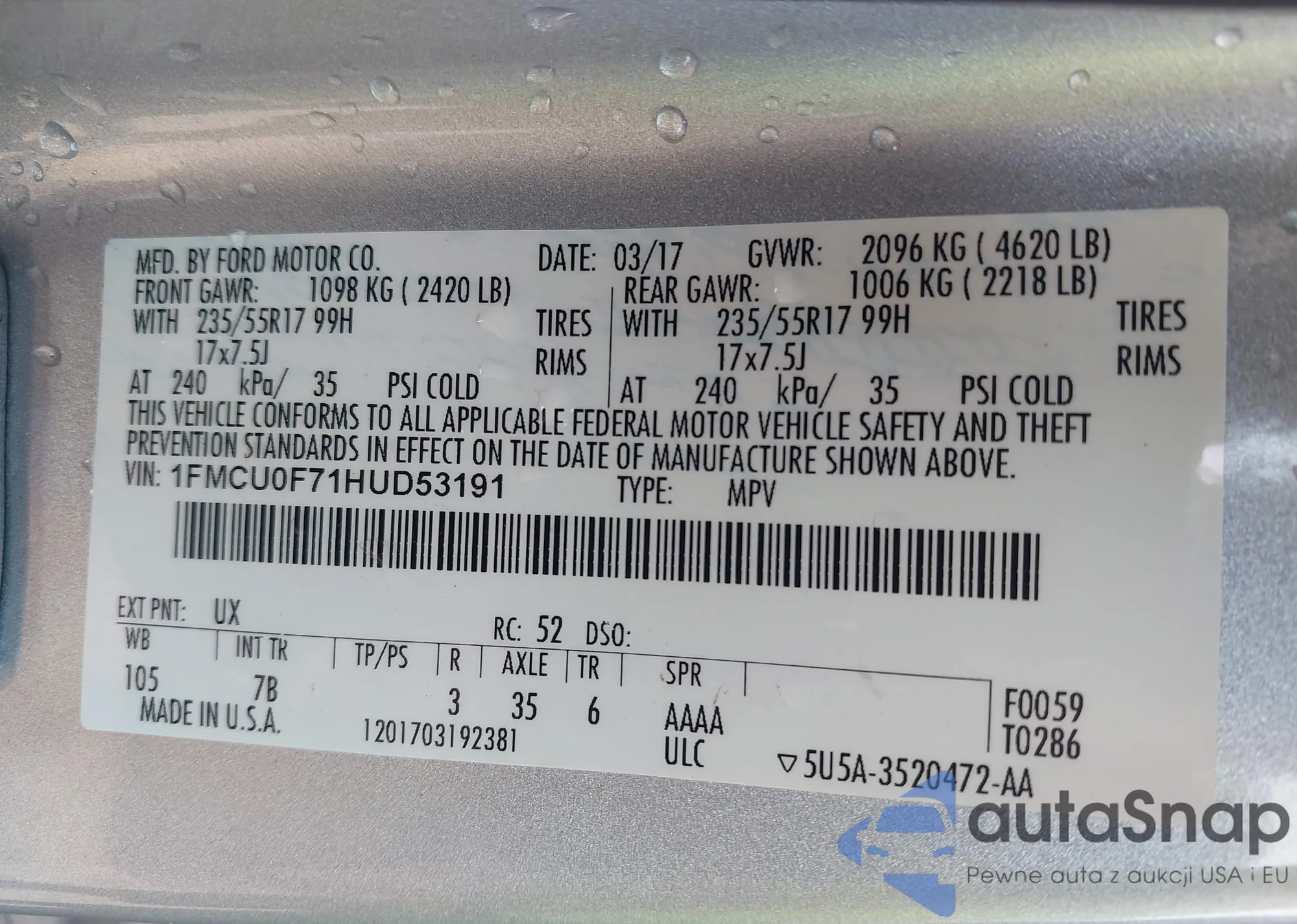 • VIN 1FMCU0F71HUD53191