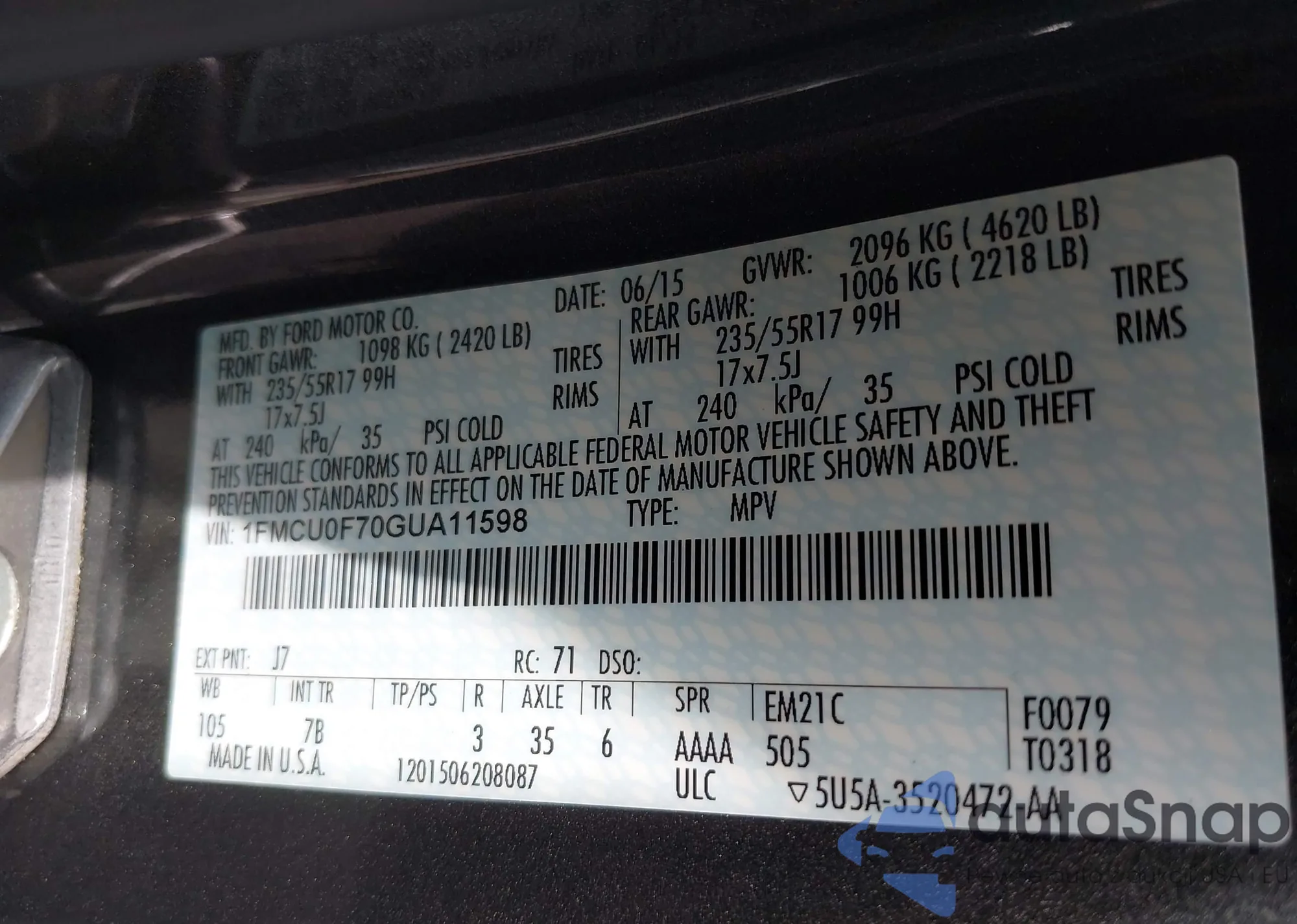 LOT: 43096515 VIN: 1FMCU0F70GUA11598