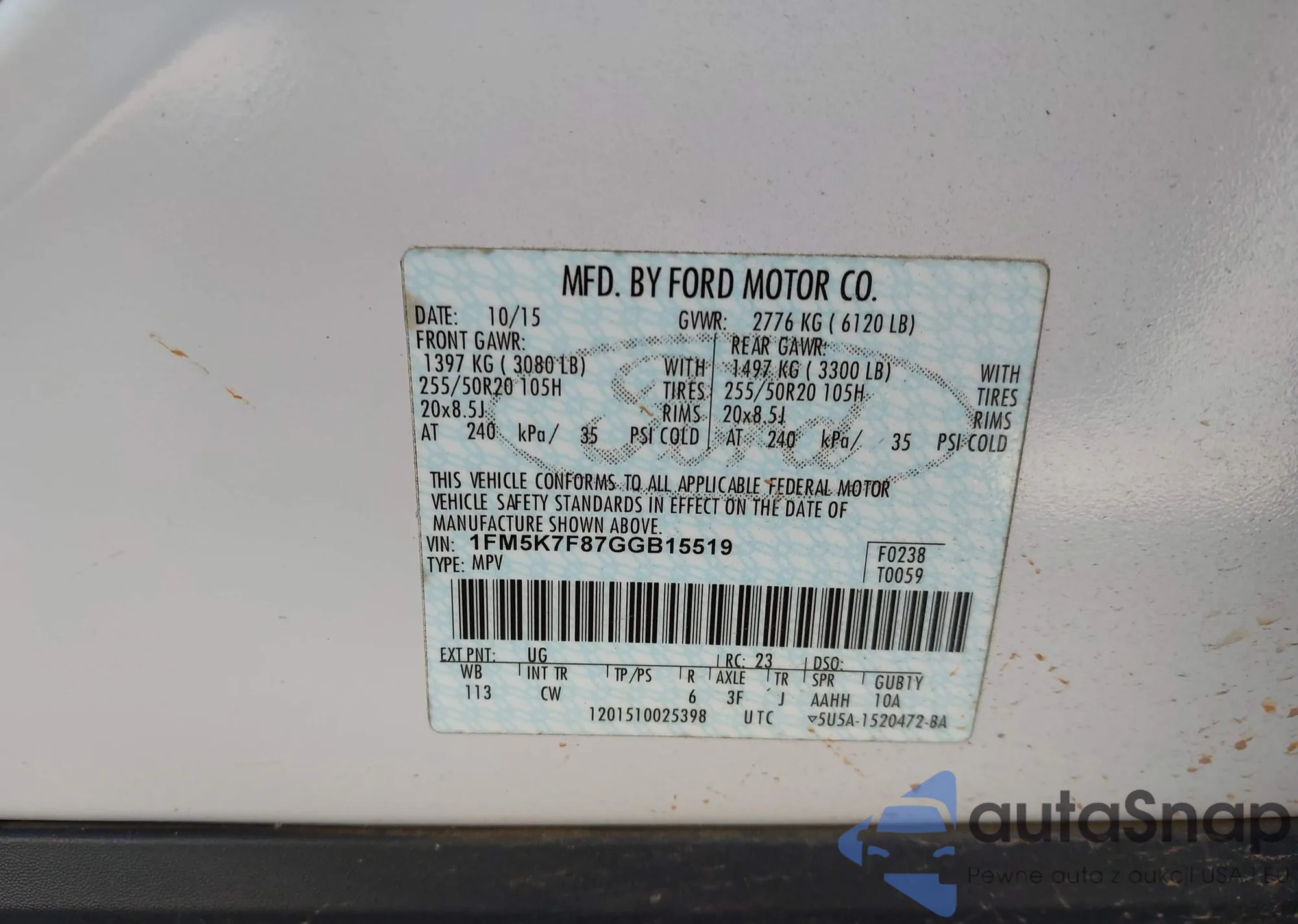 LOT: 43244455 VIN: 1FM5K7F87GGB15519