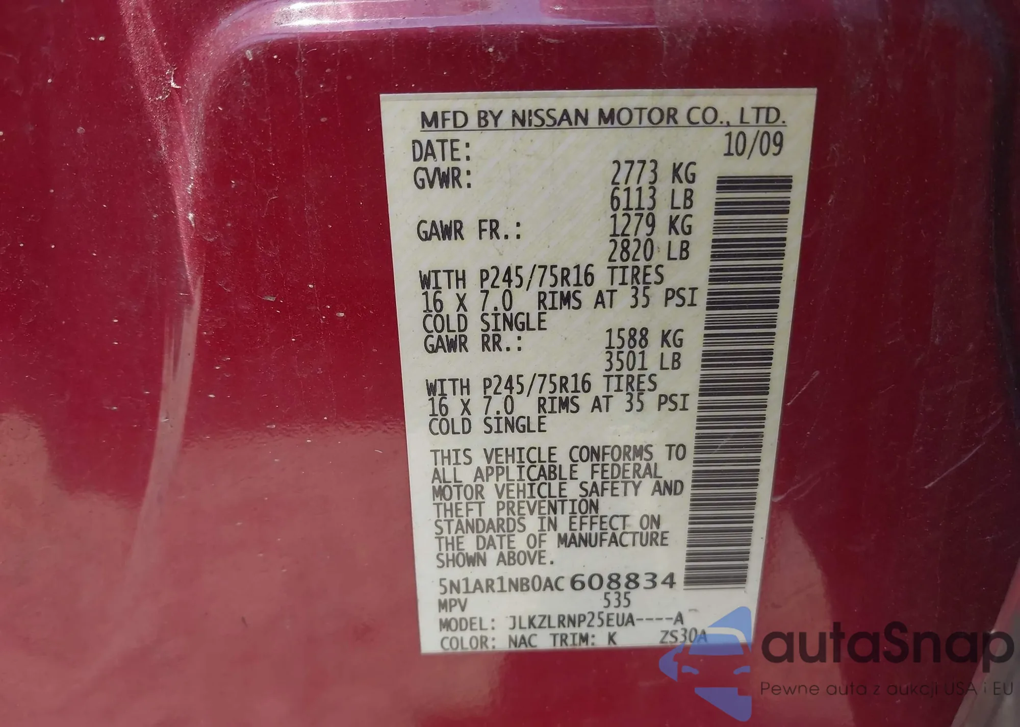 • VIN 5N1AR1NB0AC608834