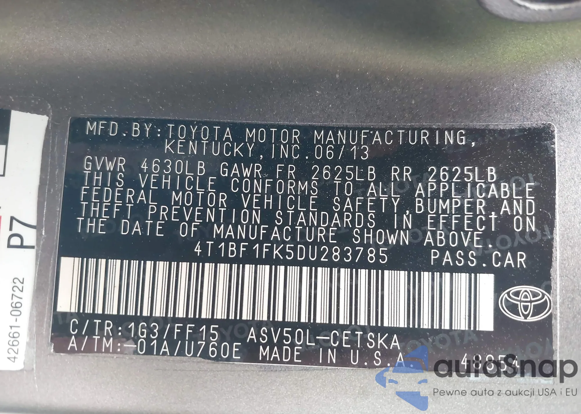LOT: 42658511 VIN: 4T1BF1FK5DU283785