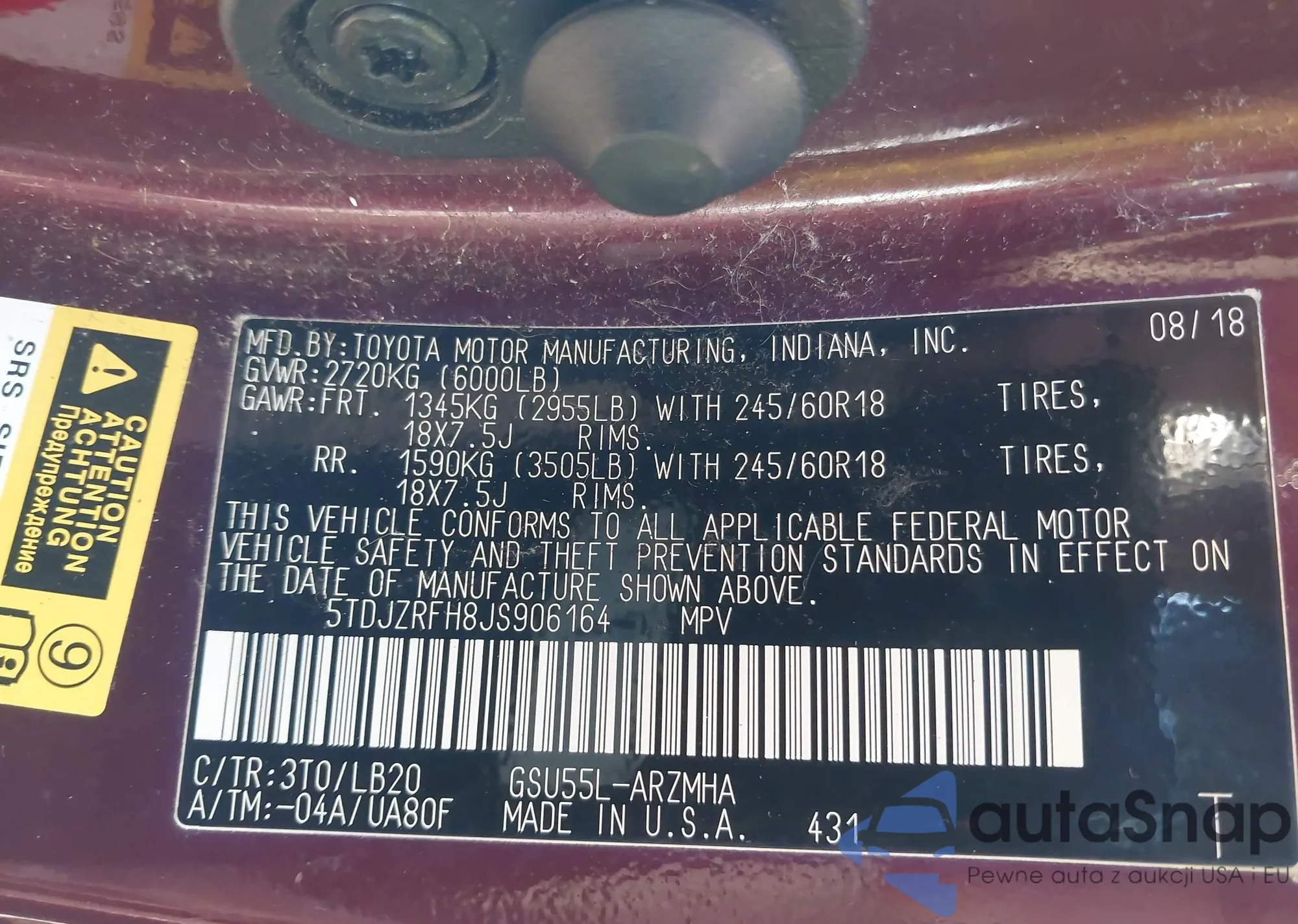 LOT: 42723544 VIN: 5TDJZRFH8JS906164