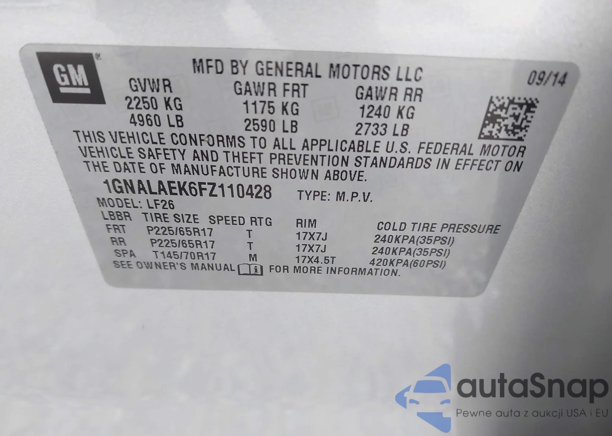 LOT: 42754885 VIN: 1GNALAEK6FZ110428