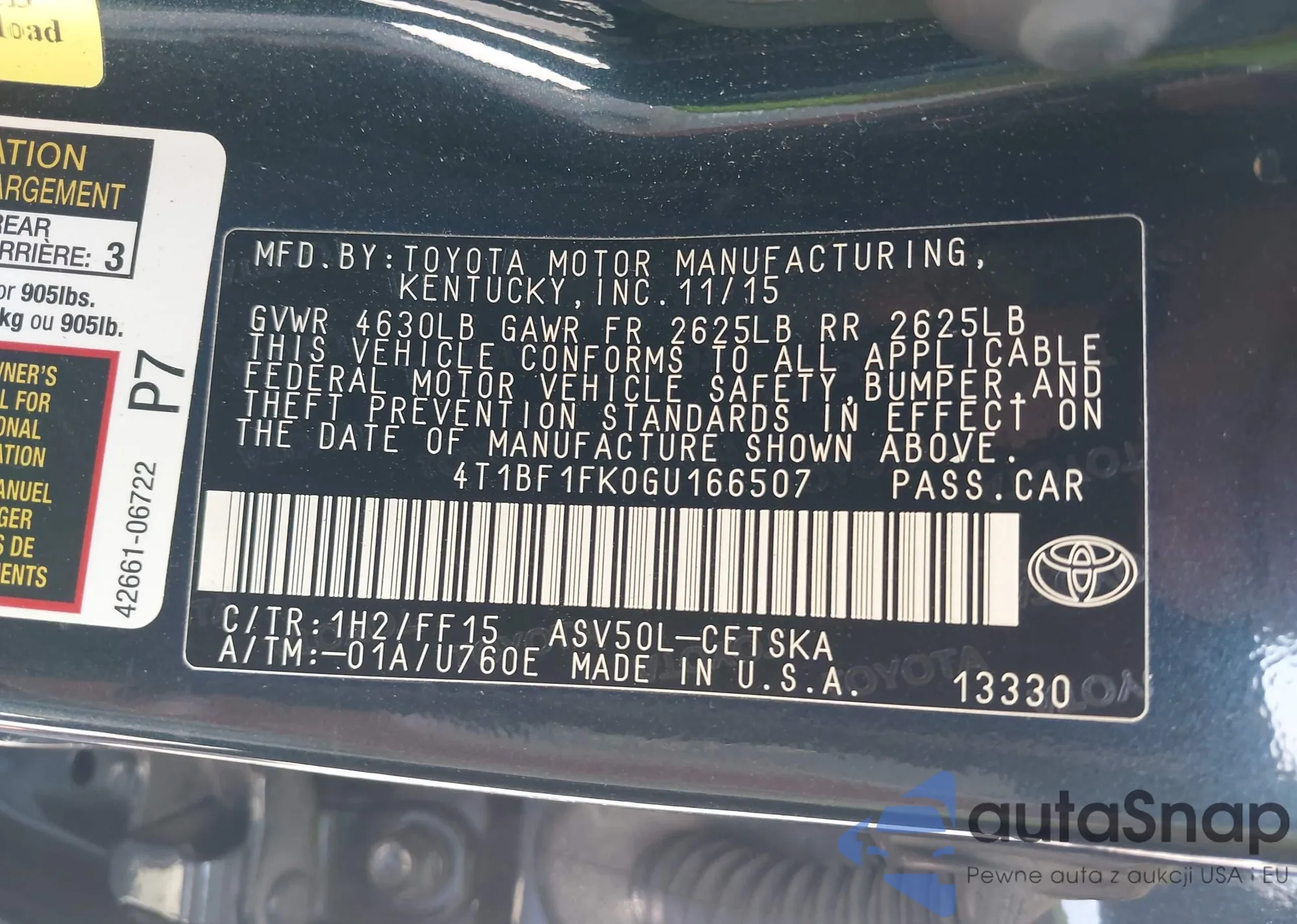 • VIN 4T1BF1FK0GU166507