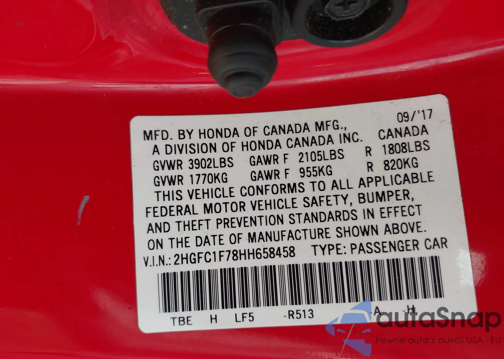 LOT: 42785931 VIN: 2HGFC1F78HH658458