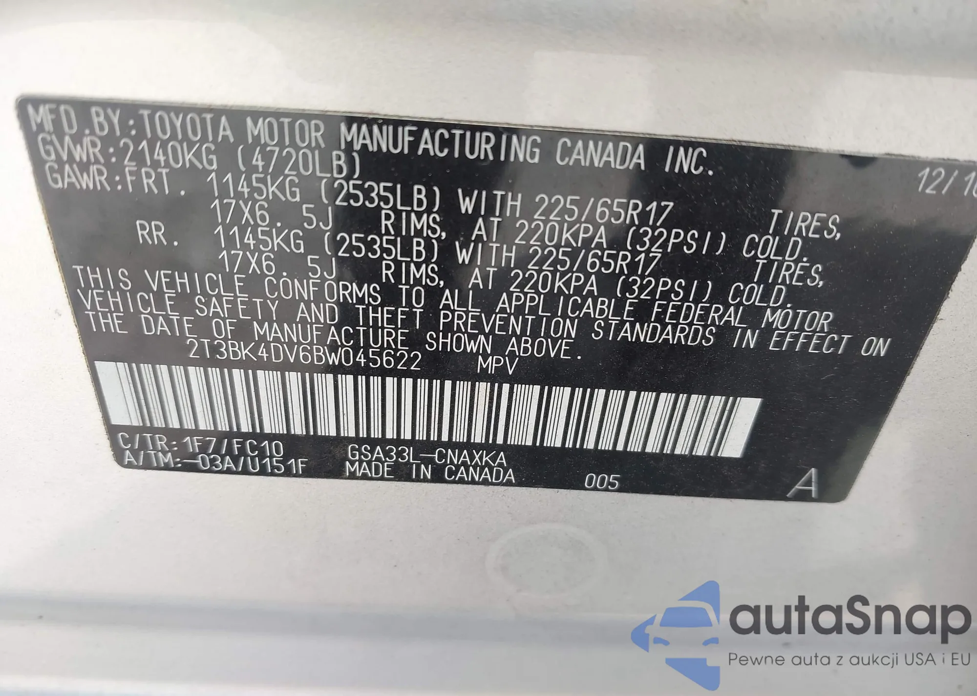 • VIN 2T3BK4DV6BW045622