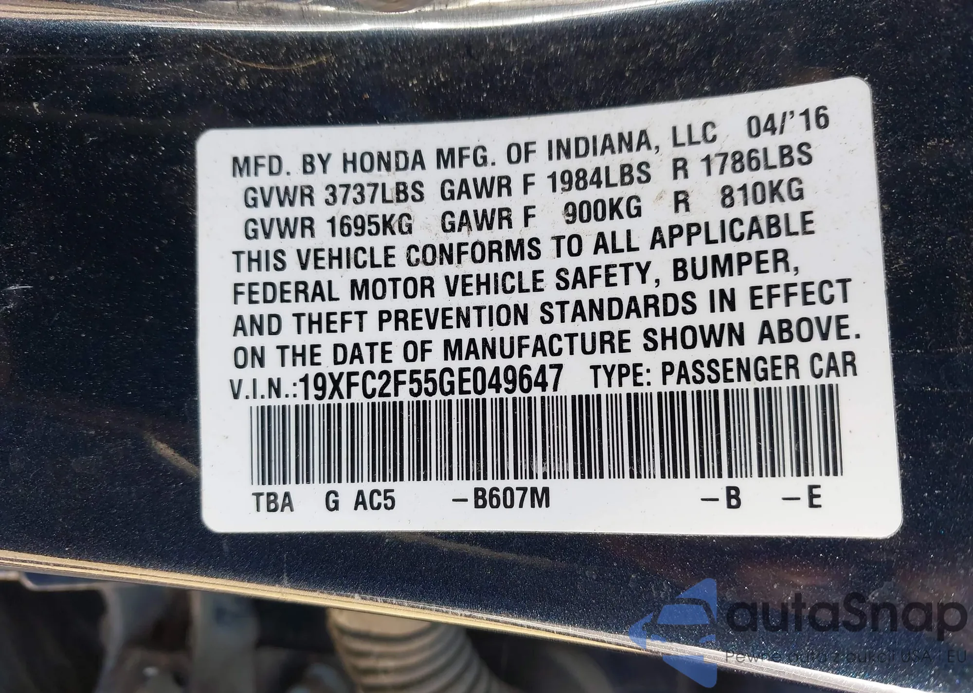 LOT: 43053401 VIN: 2HGFG3B53DH510751