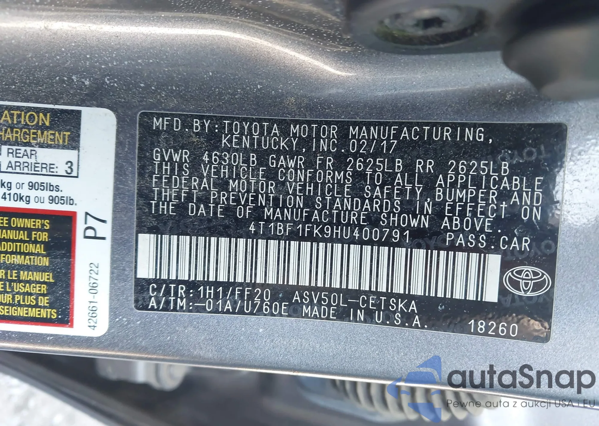 • VIN 4T1BF1FK9HU400791