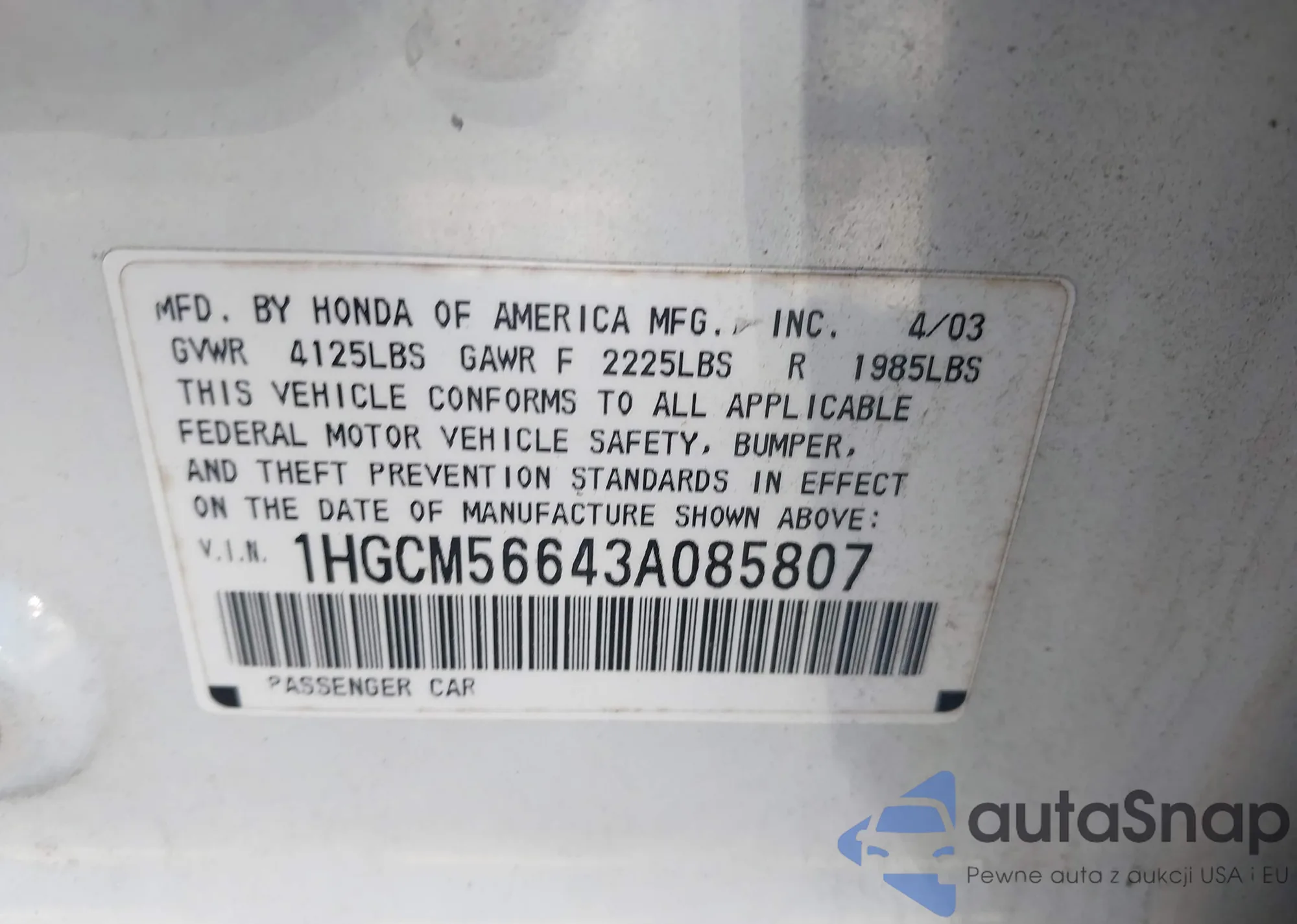 LOT: 43340064 VIN: 1HGCM56643A085807
