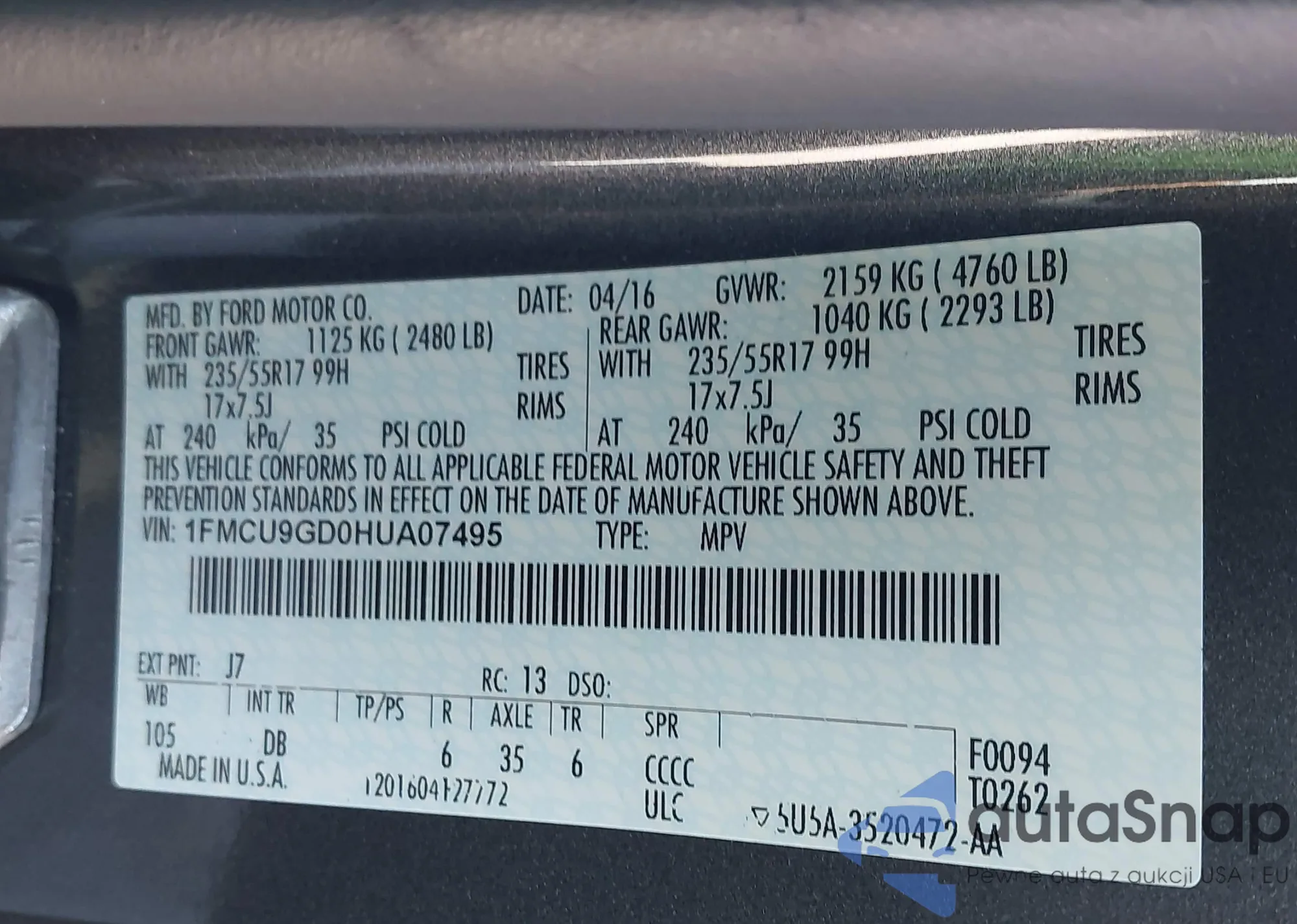 • VIN 1FMCU9GD0HUA07495