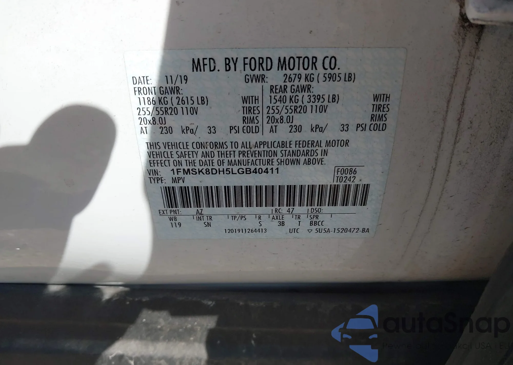 • VIN 1FMSK8DH5LGB40411