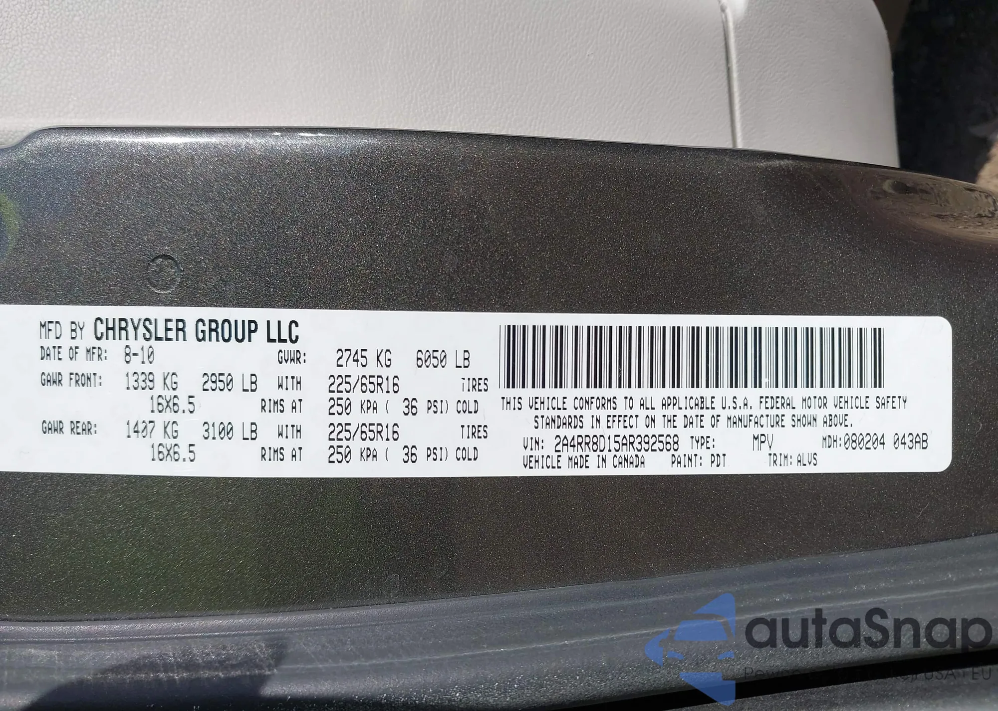 LOT: 43356858 VIN: 2A4RR8D15AR392568