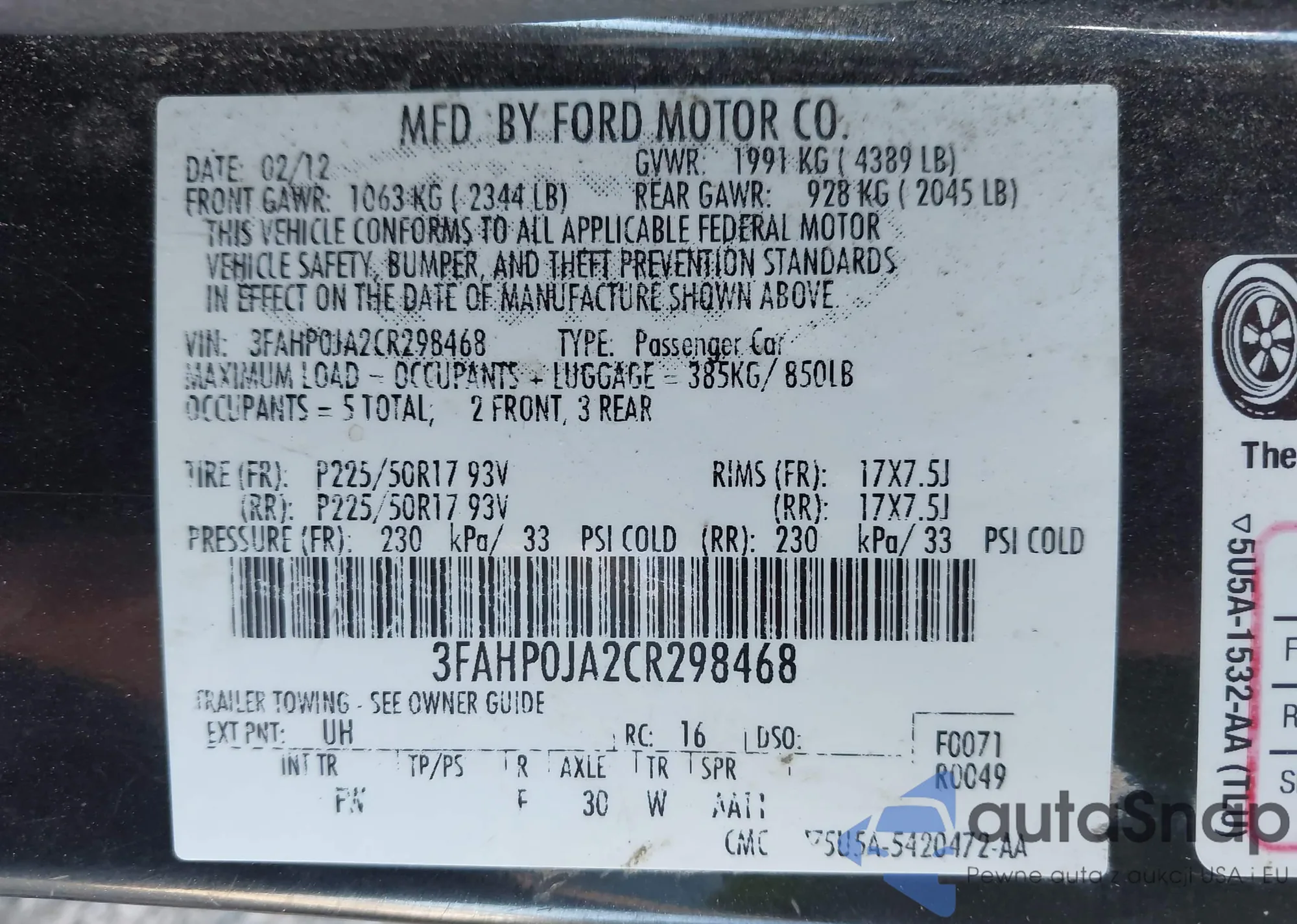 • VIN 3FAHP0JA2CR298468