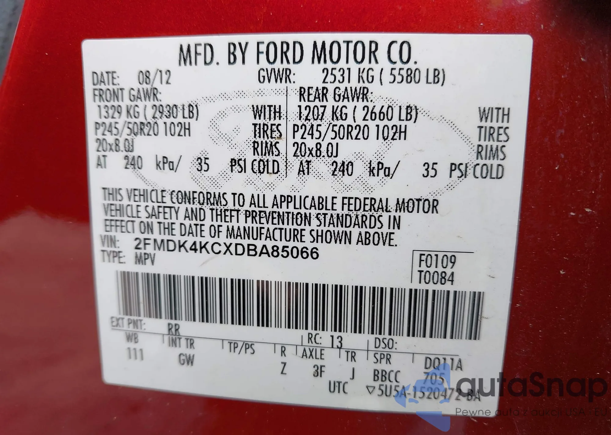 • VIN 2FMDK4KCXDBA85066