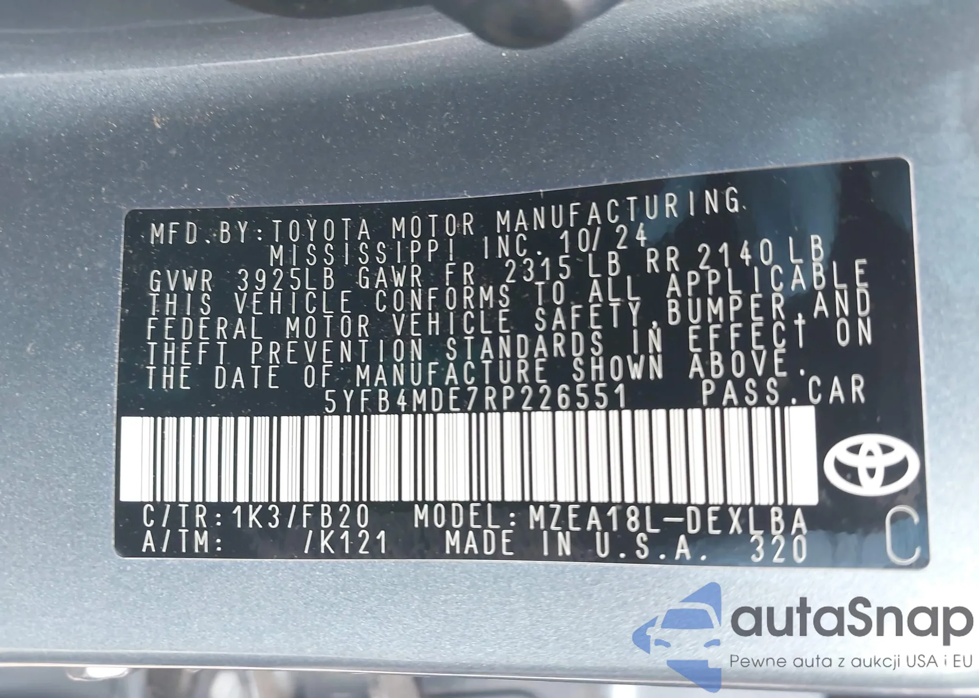 • VIN 5YFB4MDE7RP226551
