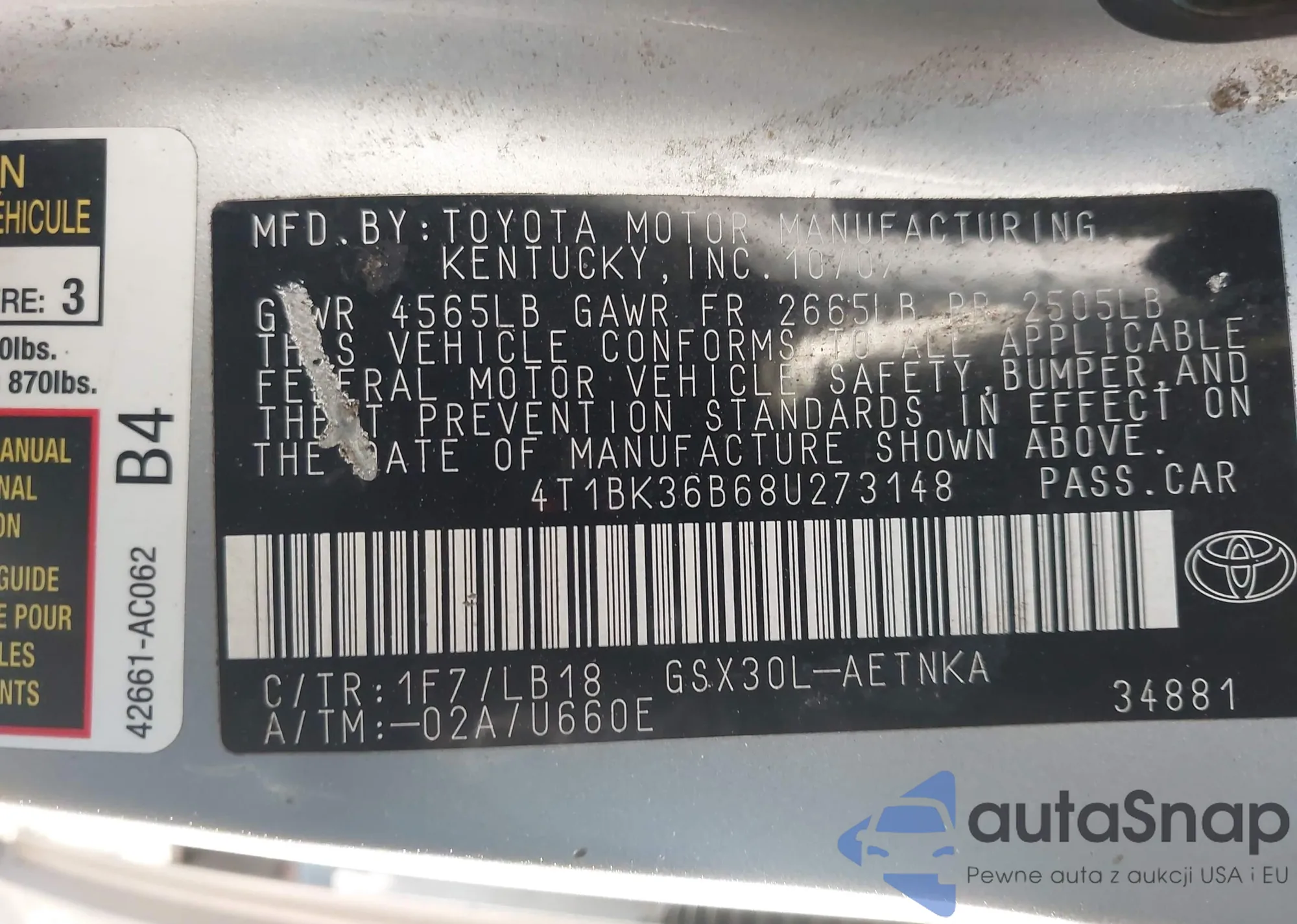 • VIN 4T1BK36B68U273148