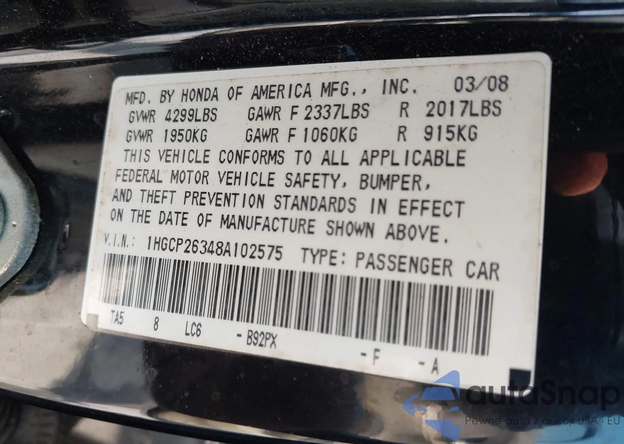 LOT: 43267976 VIN: 1HGCP2F80BA087303