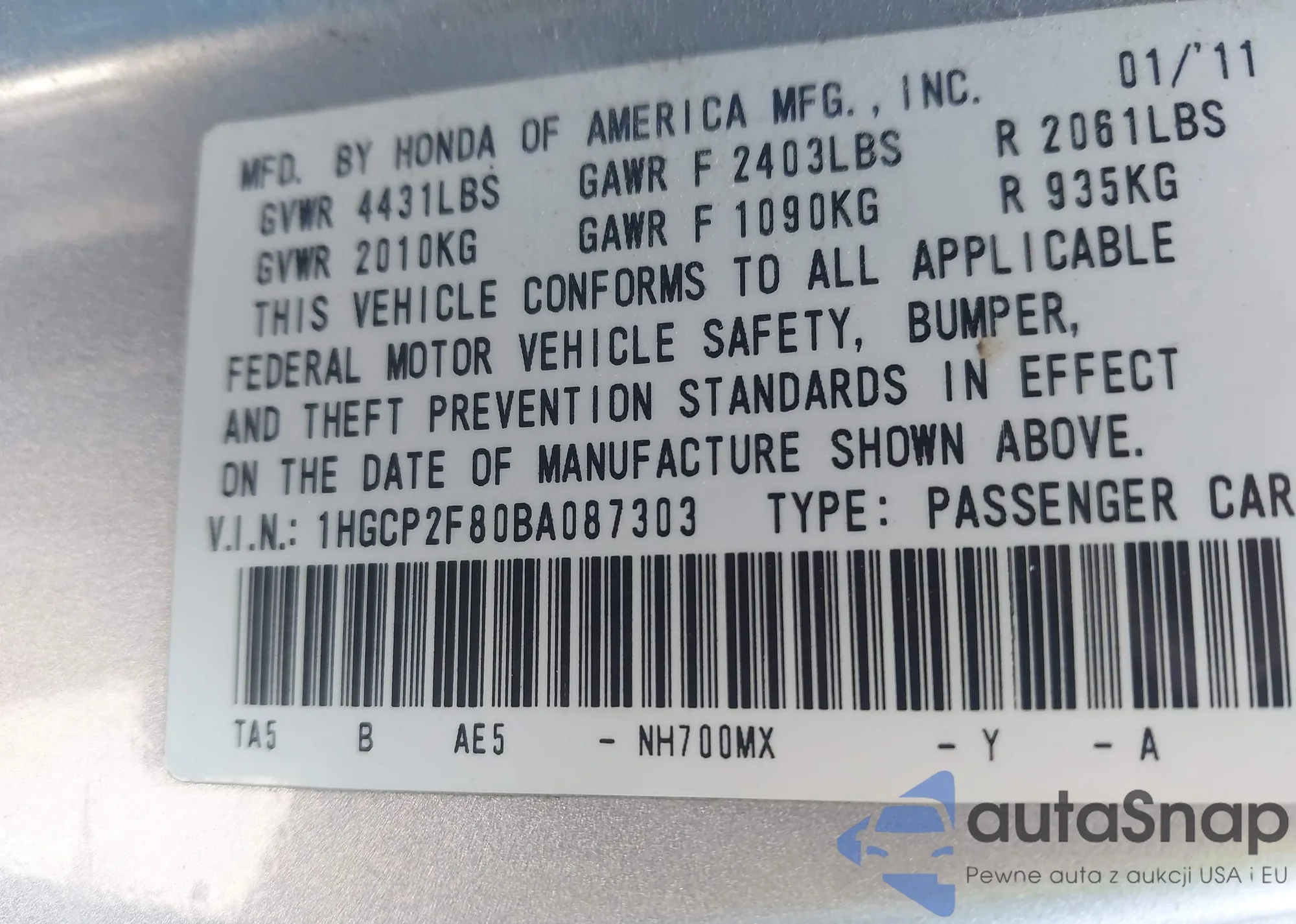 • VIN 1HGCP2F80BA087303