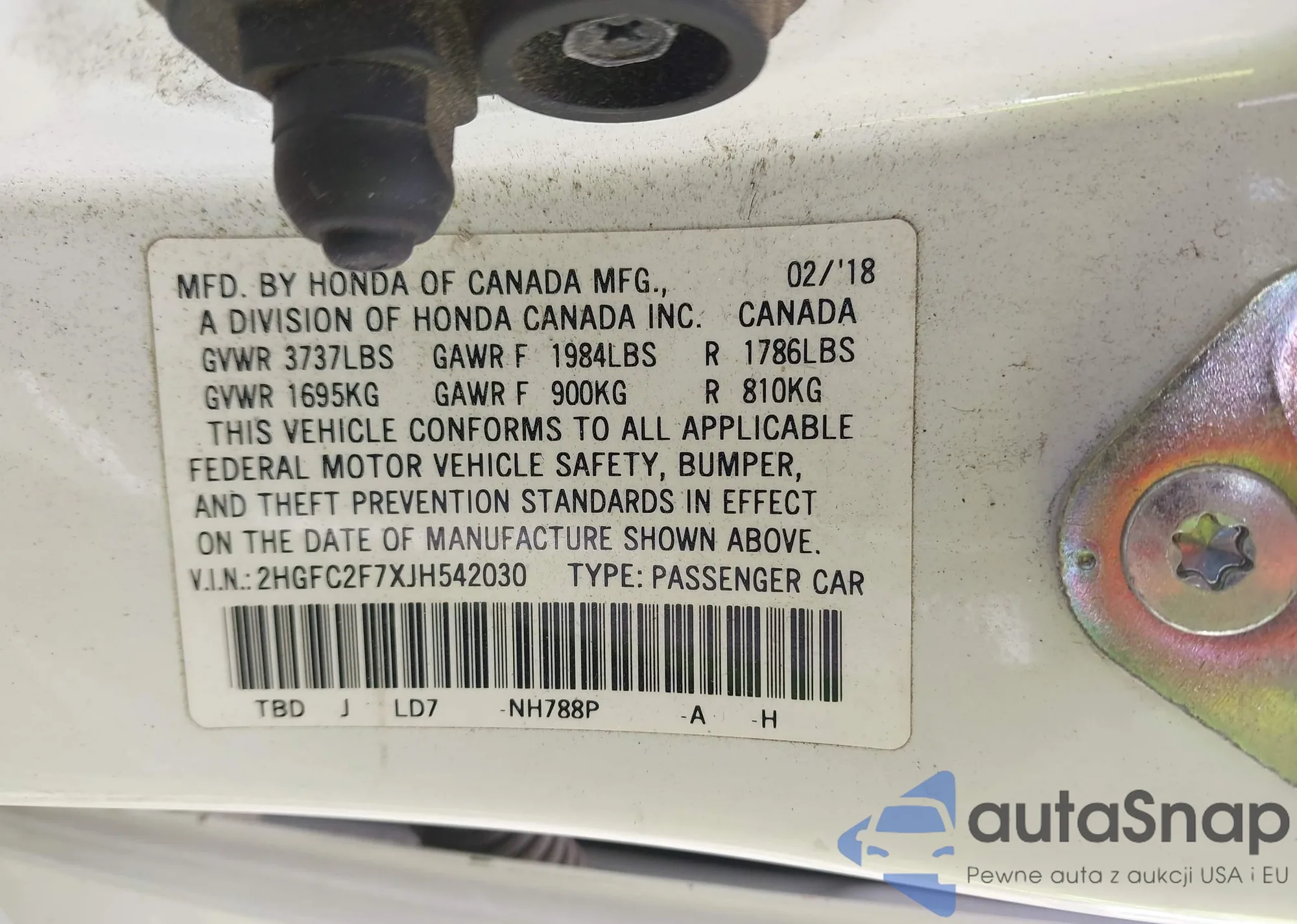 • VIN 2HGFC2F7XJH542030