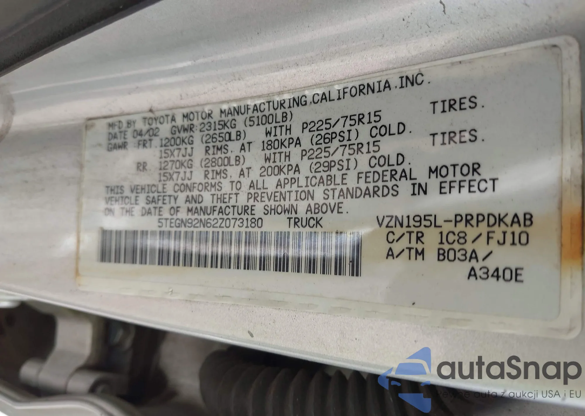 • VIN 5TEGN92N62Z073180
