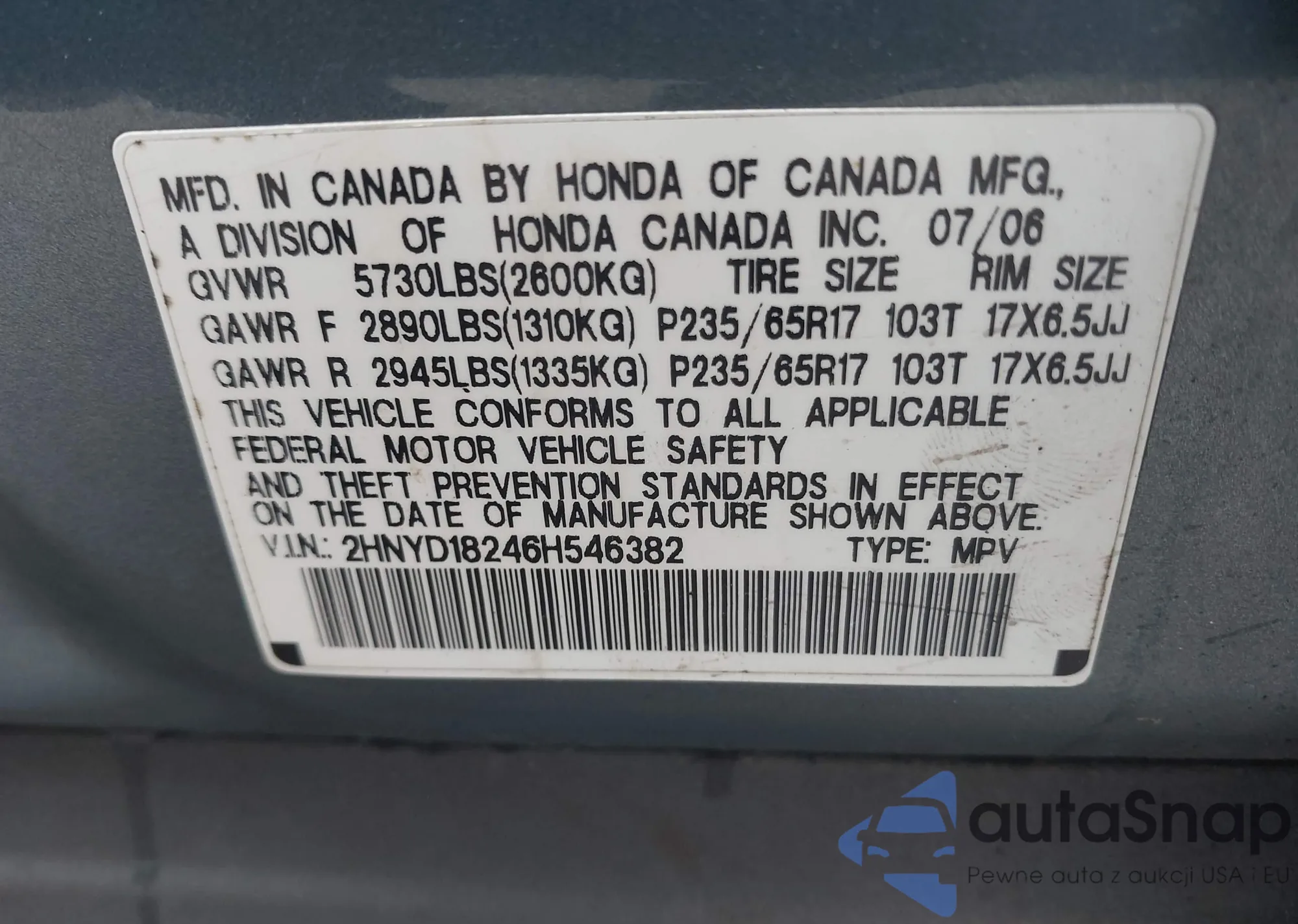 LOT: 43181005 VIN: 2HNYD18246H546382