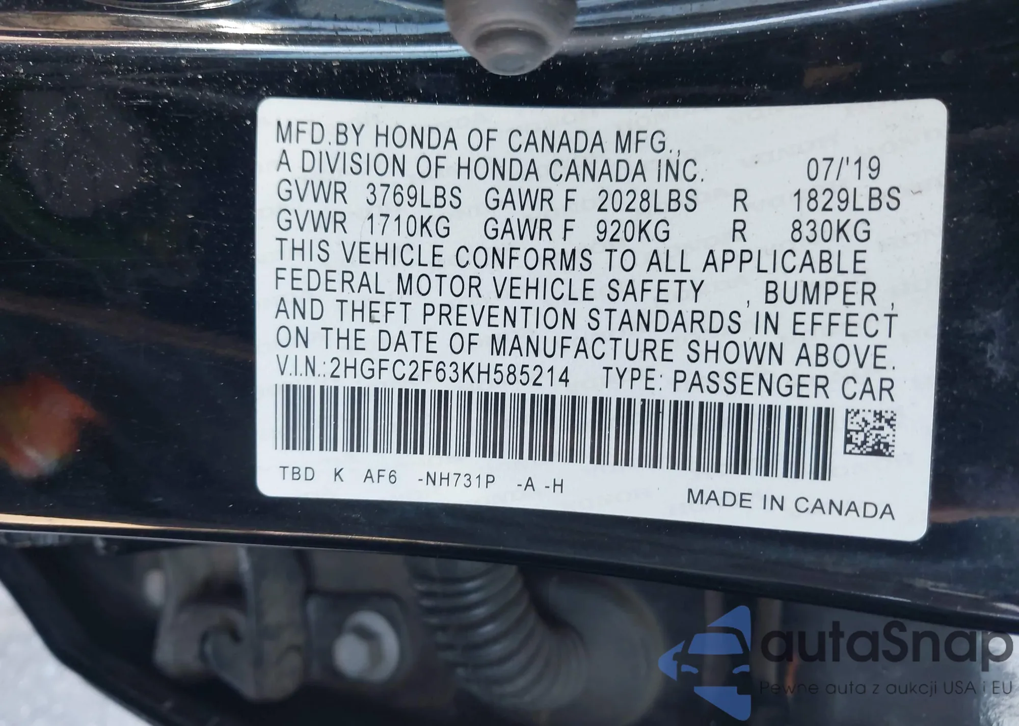 • VIN 2HGFC2F63KH585214