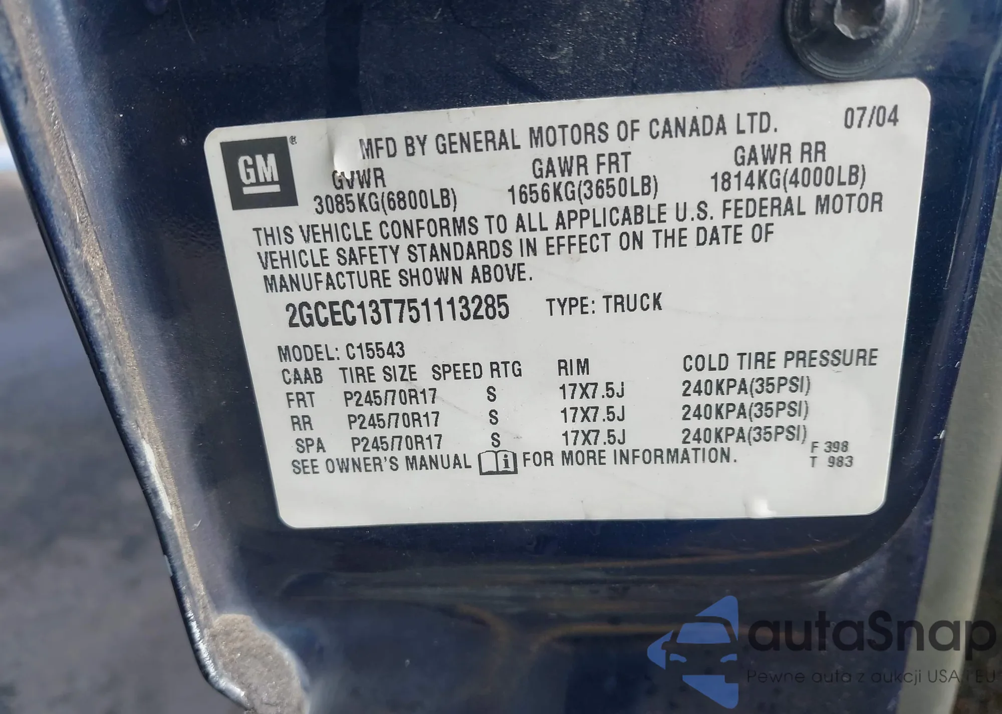 • VIN 2GCEC13T751113285