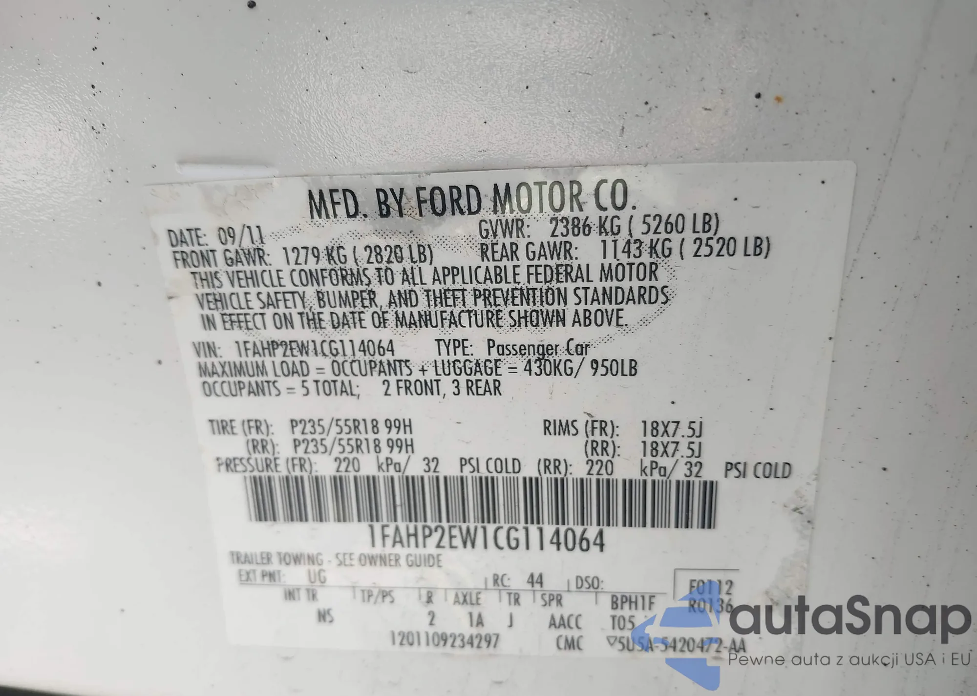 LOT: 43381058 VIN: 1FAHP2EW1CG114064