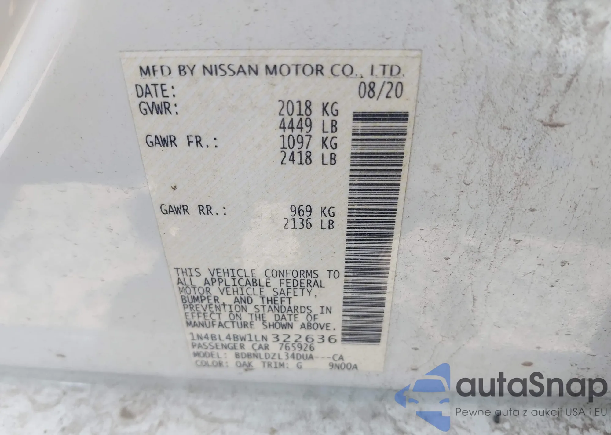 LOT: 42926061 VIN: 1N4BL4BW1LN322636