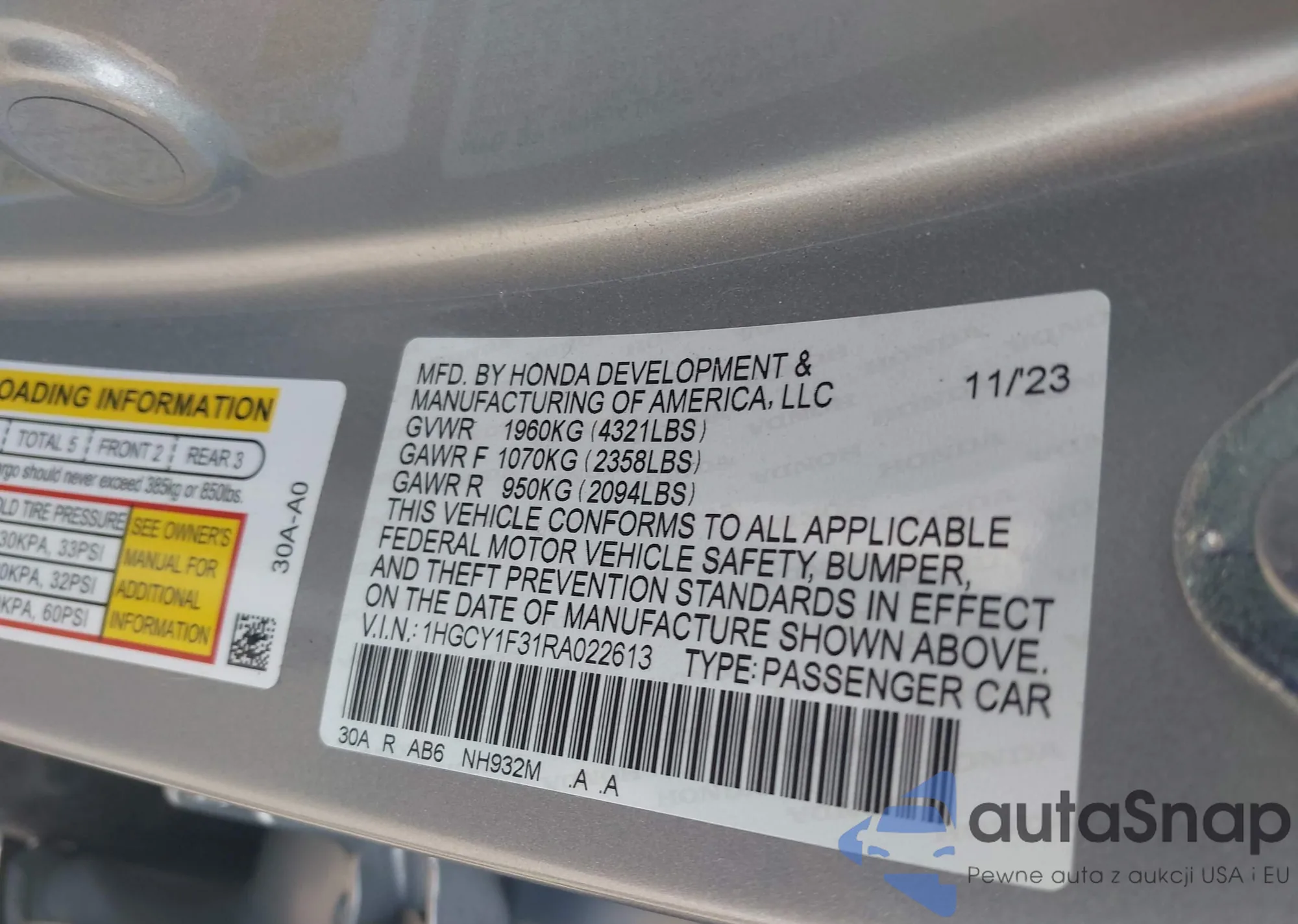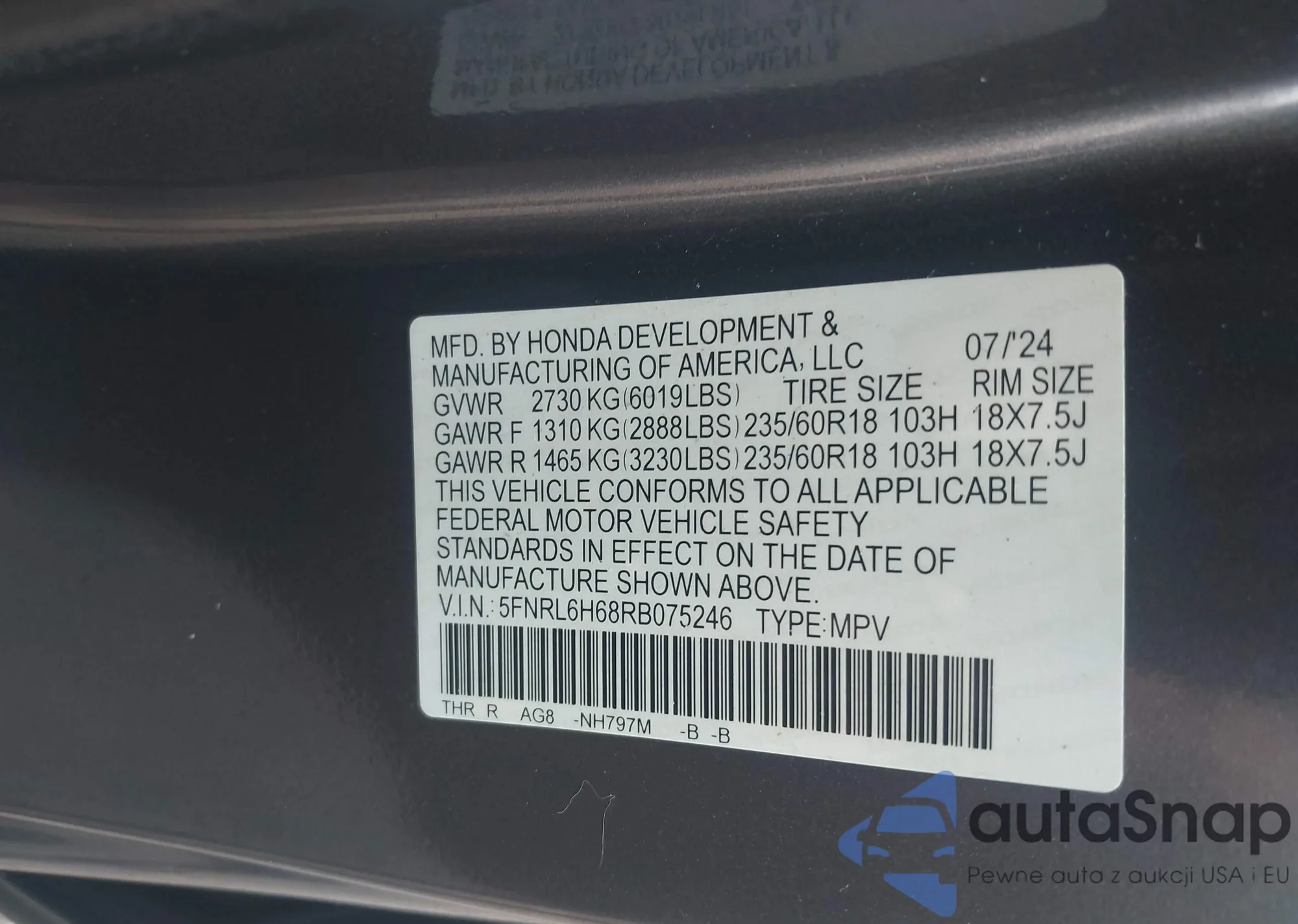 • VIN 5J6RM4H59GL018647
