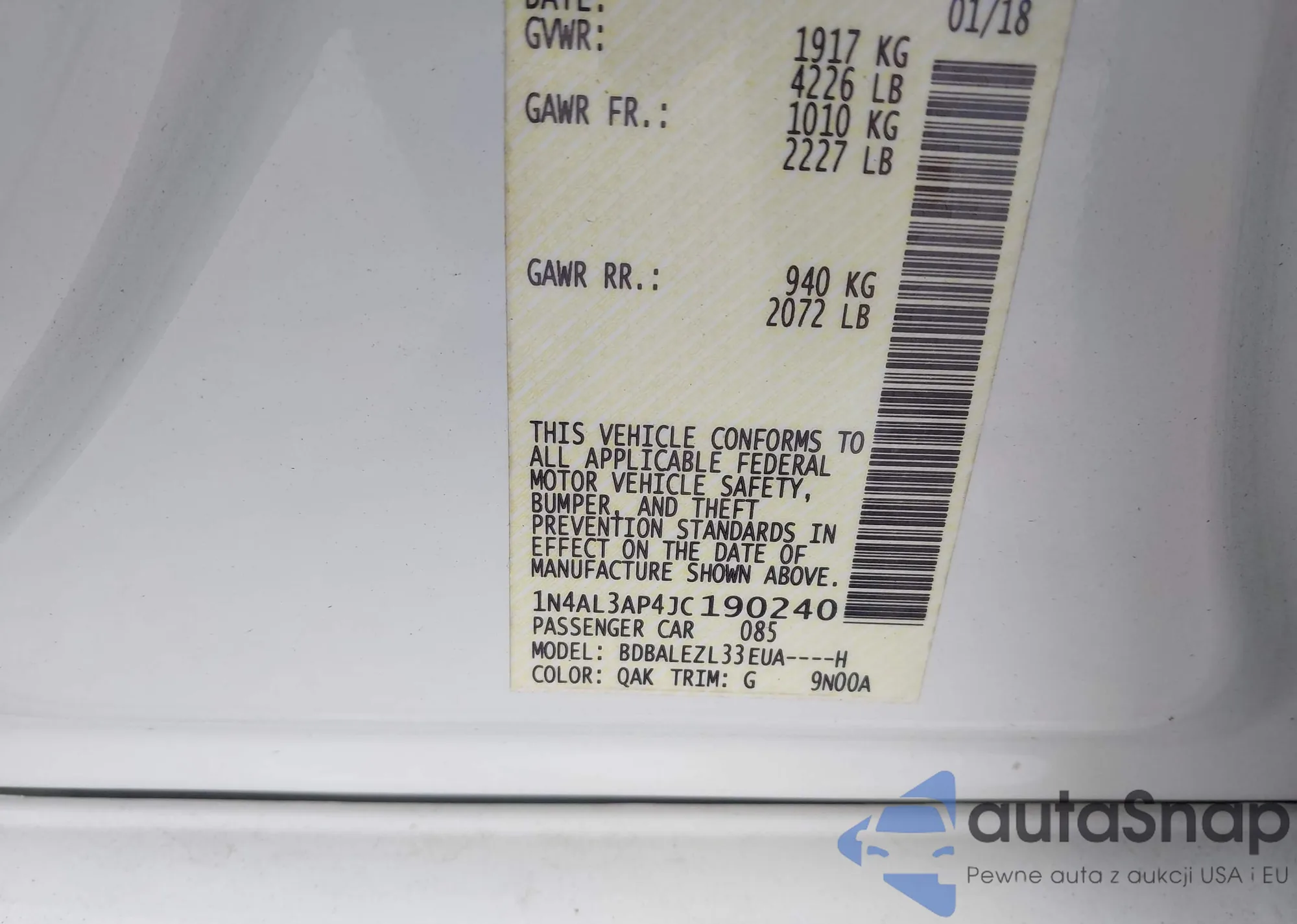 LOT: 43222191 VIN: 1N4AL3AP4JC190240