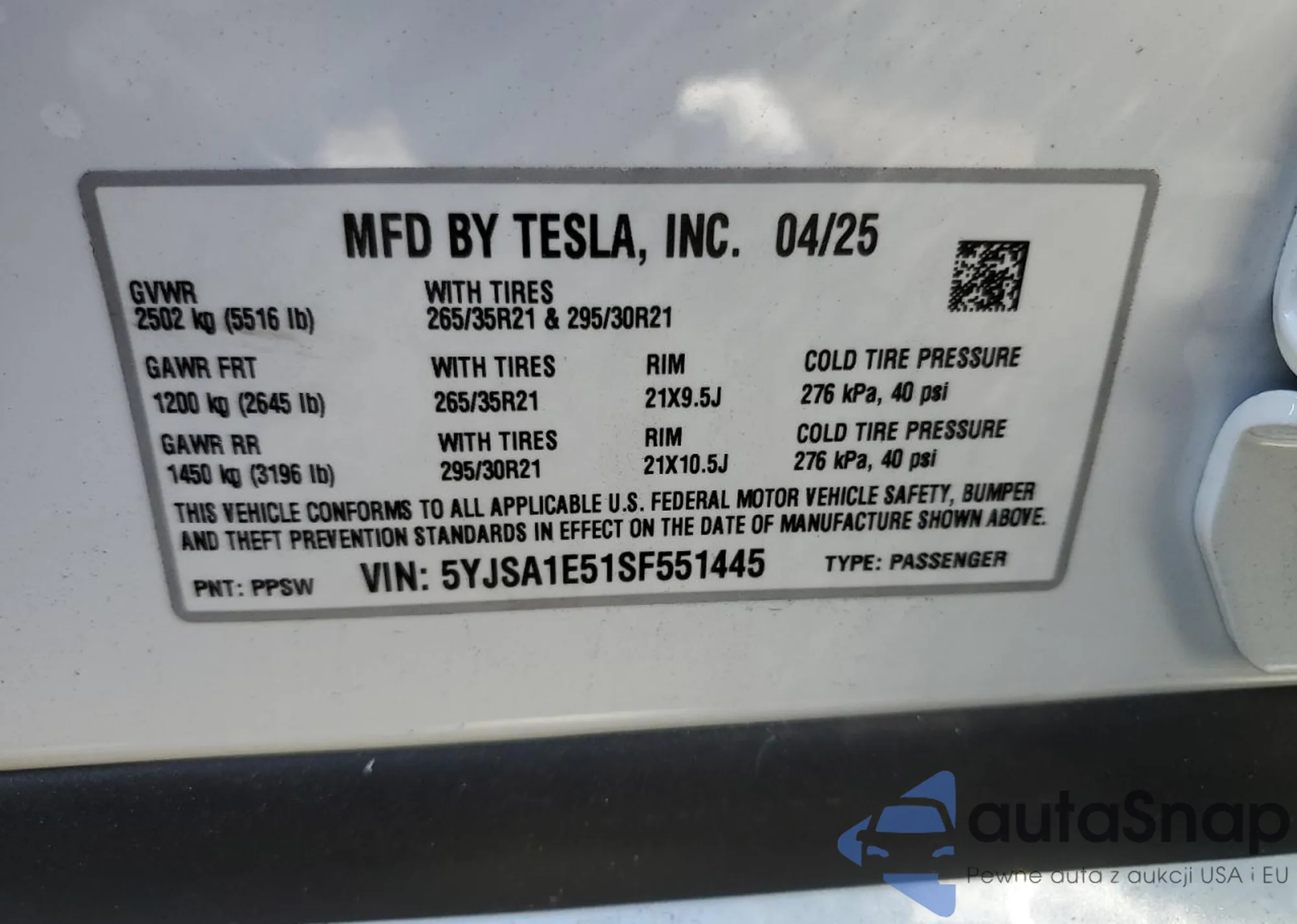 2025 Tesla Model S z USA, uszkodzony, nr VIN 5YJSA1E51SF551445