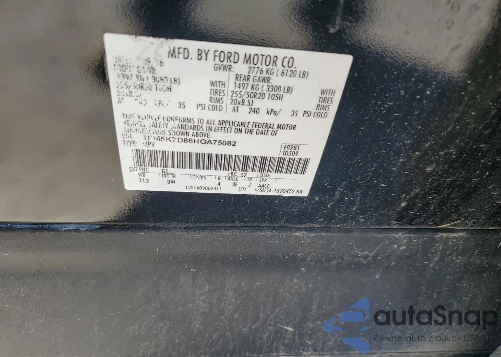 LOT: 89644415 VIN: 1FM5K7D86HGA75082