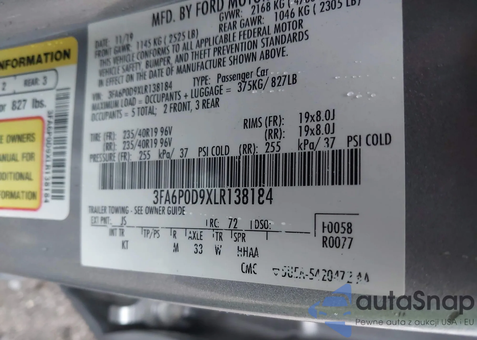 LOT: 43026106 VIN: 3FA6P0D9XLR138184