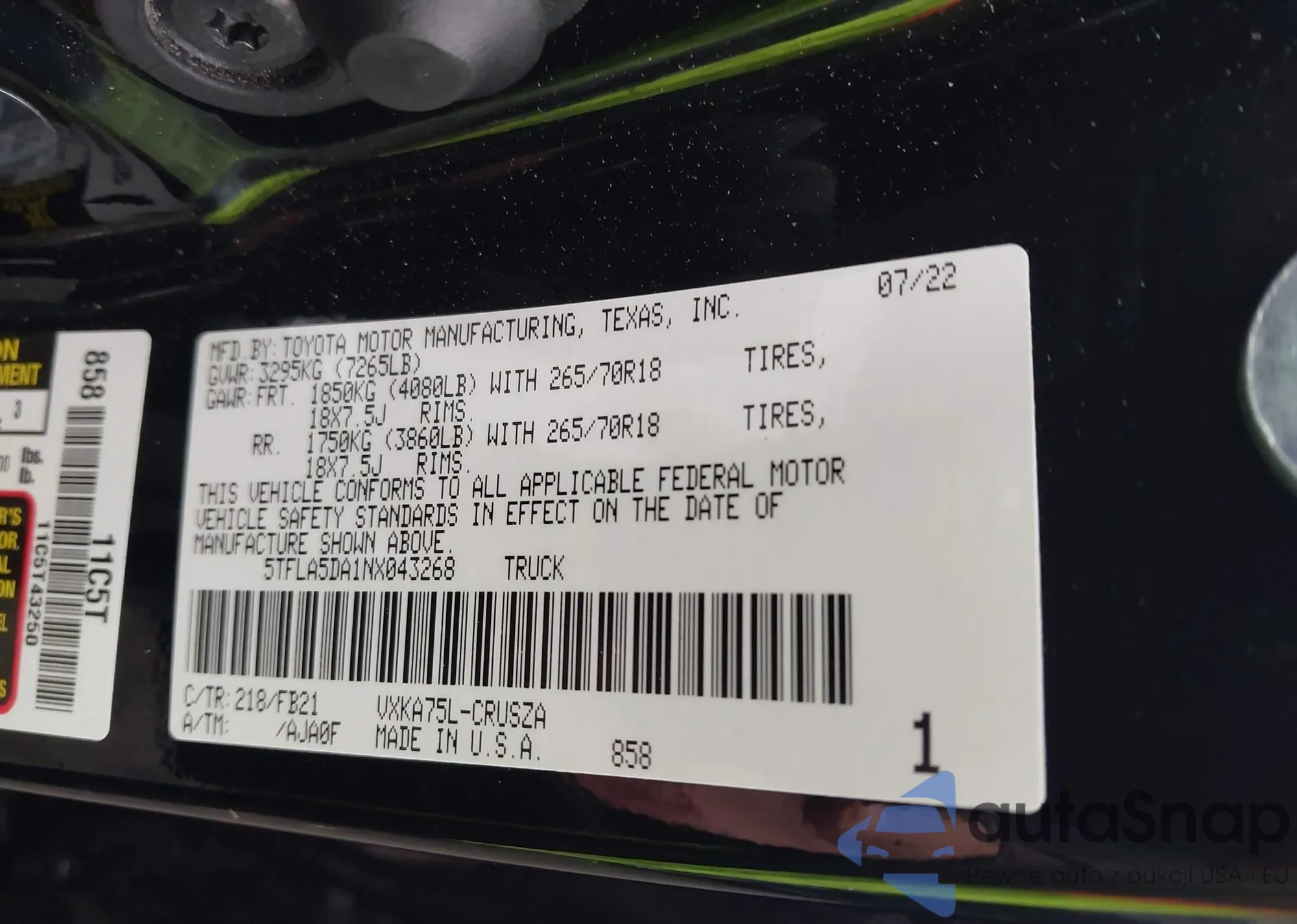 • VIN 5TFLA5DA1NX043268